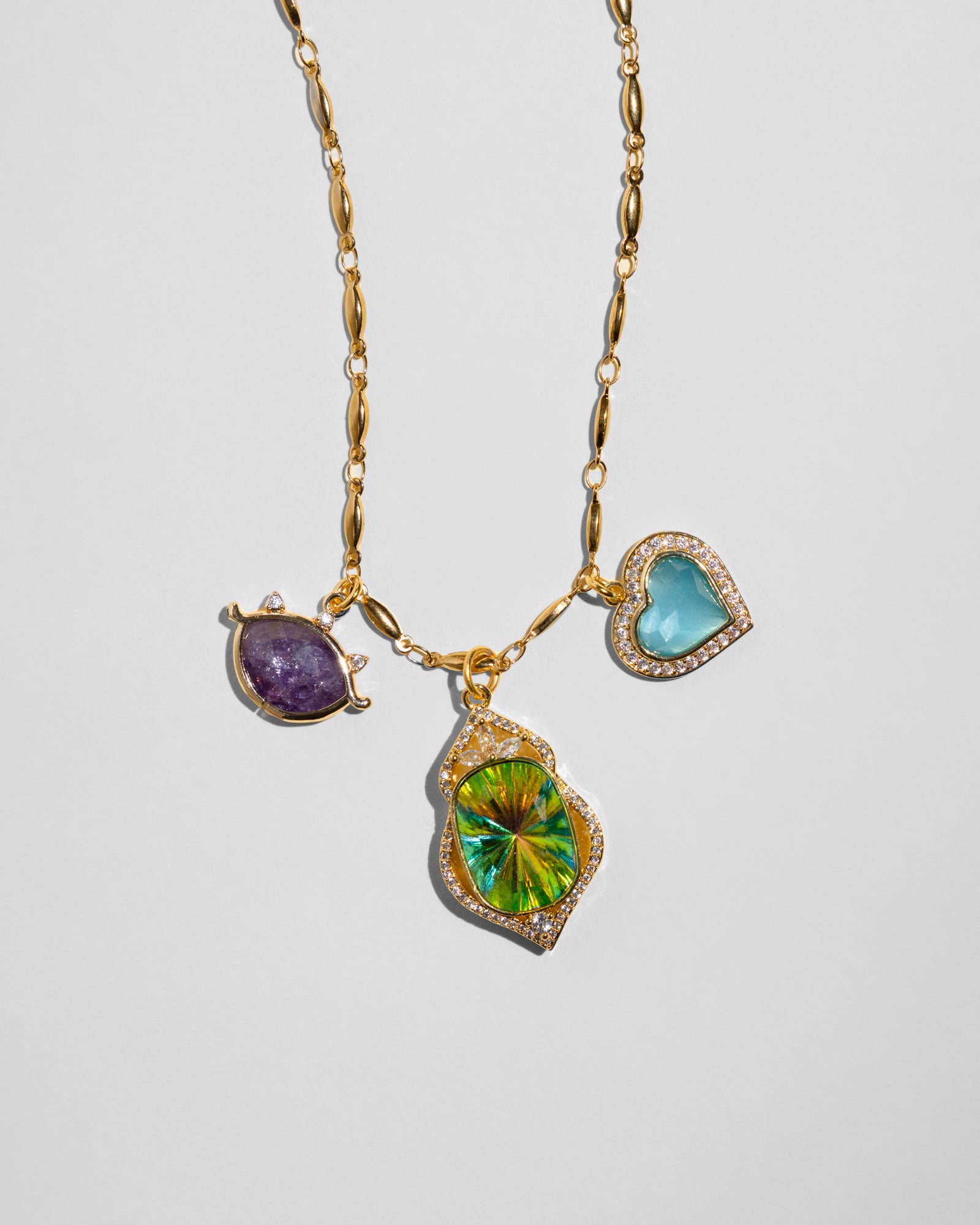 This one always gets compliments — a mid-length gold plated chain with three playful charms. The central ornament sparkles with tiny crystals and instantly lifts your look. It’s easy, polished, and just the right amount of fun.