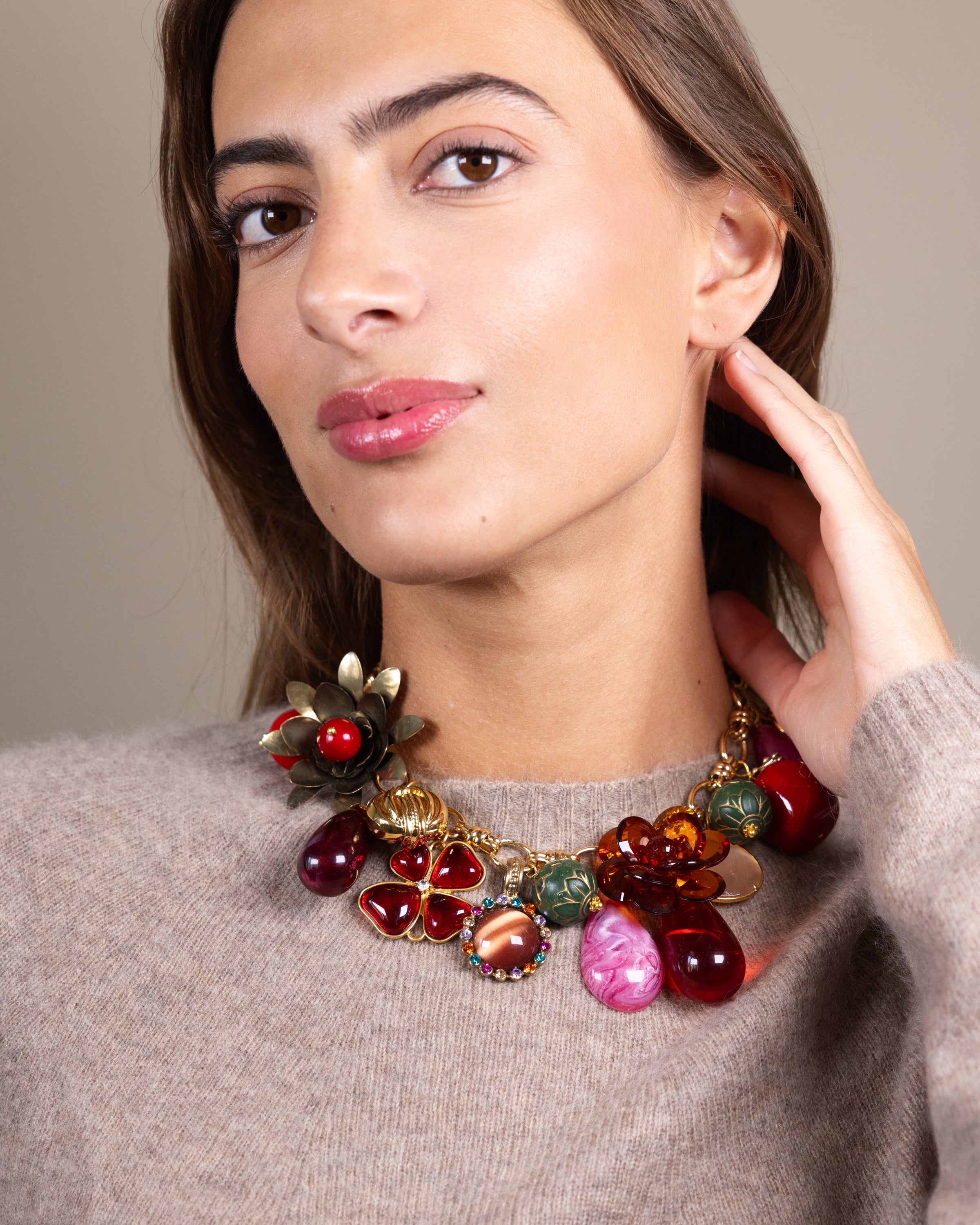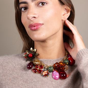 The Olivia short chain necklace mixes vintage acrylic drops, leaves, and a metal flower into something truly special. It looks bold but feels light, so you’ll forget you’re wearing it—until the compliments start. The soft lilacs, cool blues, and elegant greens blend beautifully together. It’s the kind of piece that instantly pulls a look together, effortlessly.