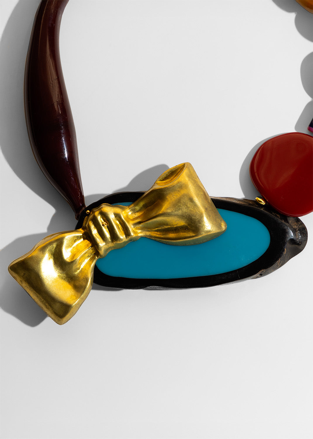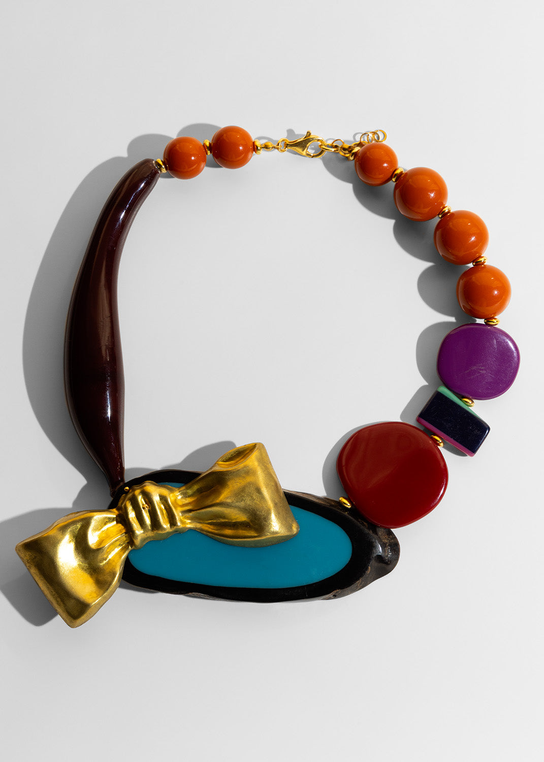 A necklace of striking contrasts and exceptional beauty — resin in wood, Murano glass, beads, and a gold-plated bronze bow come together in a piece that feels as much a collector’s treasure as an everyday adornment. It’s the kind of piece you pick when you recognize refinement in the unusual.