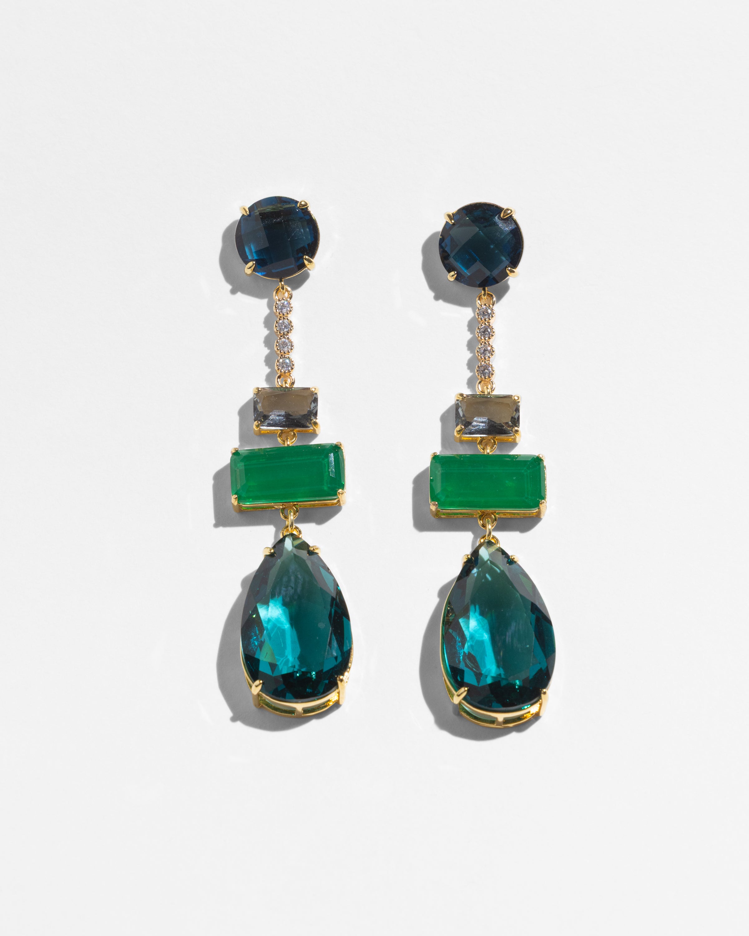 These crystal dangles are all about understated glamour — deep blues, fresh greens, and clear sparkles stacked in clean, graphic lines. They move beautifully and feel instantly polished, the kind of earrings that make even the simplest outfit look styled.