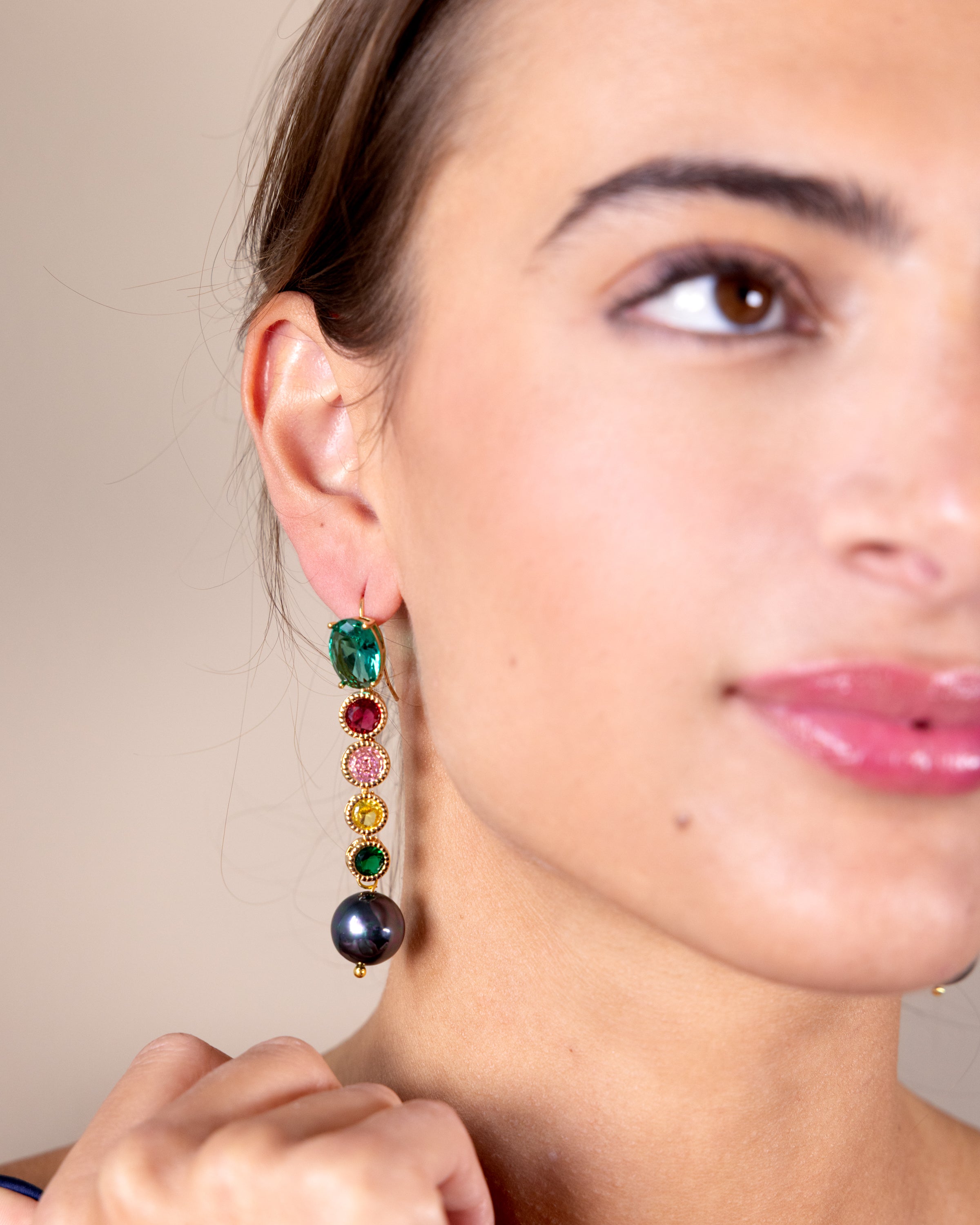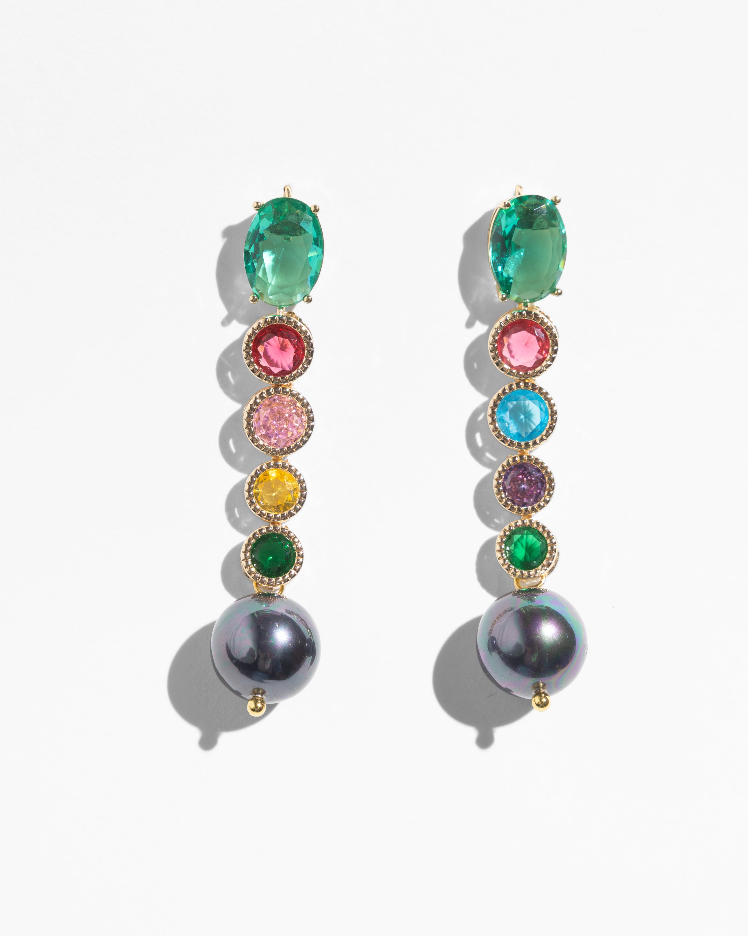 These earrings are pure color play — a vertical line of vibrant crystals ending in a glossy pearl drop. They’re bright without being loud, polished without trying too hard, the kind of pair that lifts your mood and instantly pulls a look together. Tip: wear them with something simple on top and let the colors do their thing.