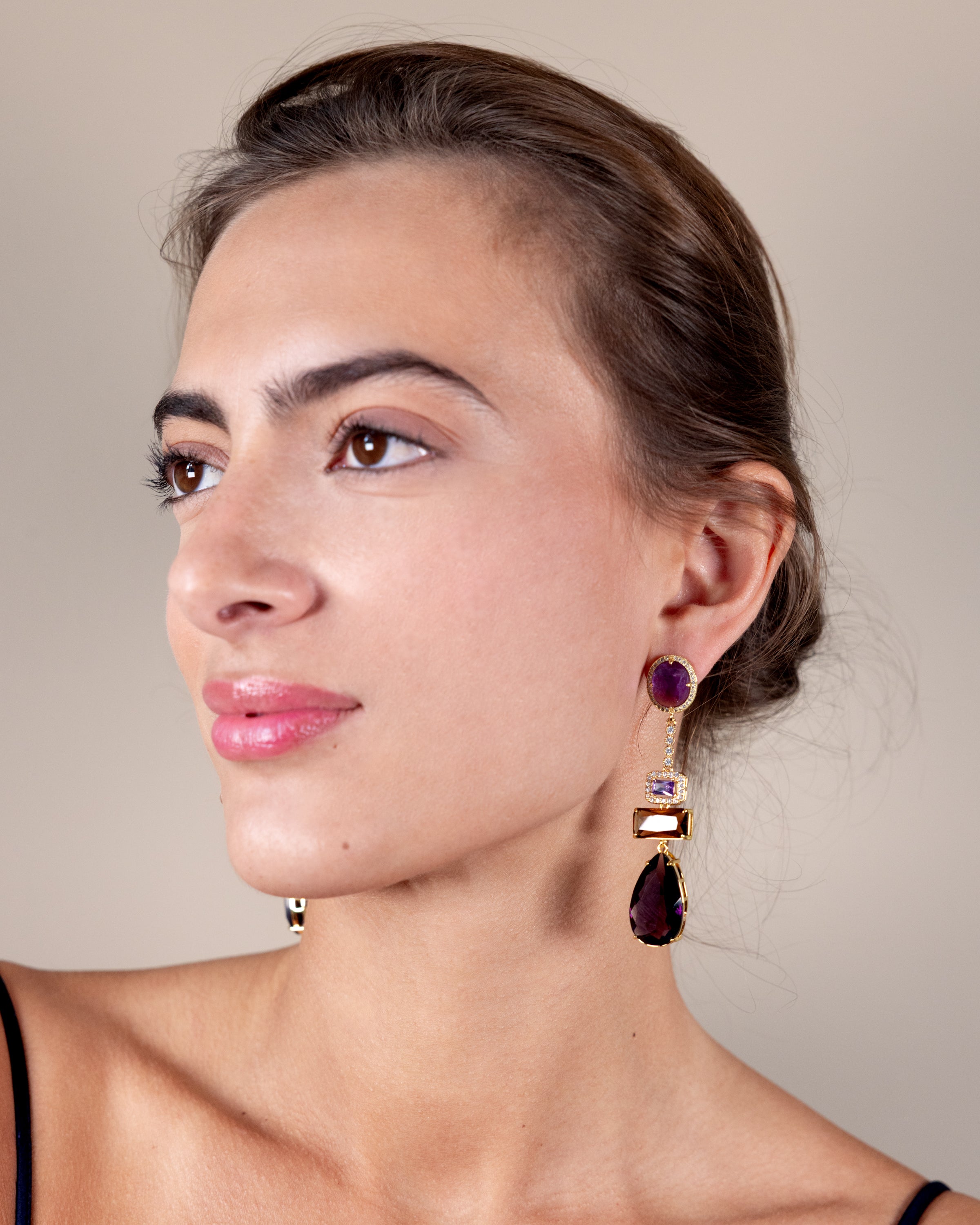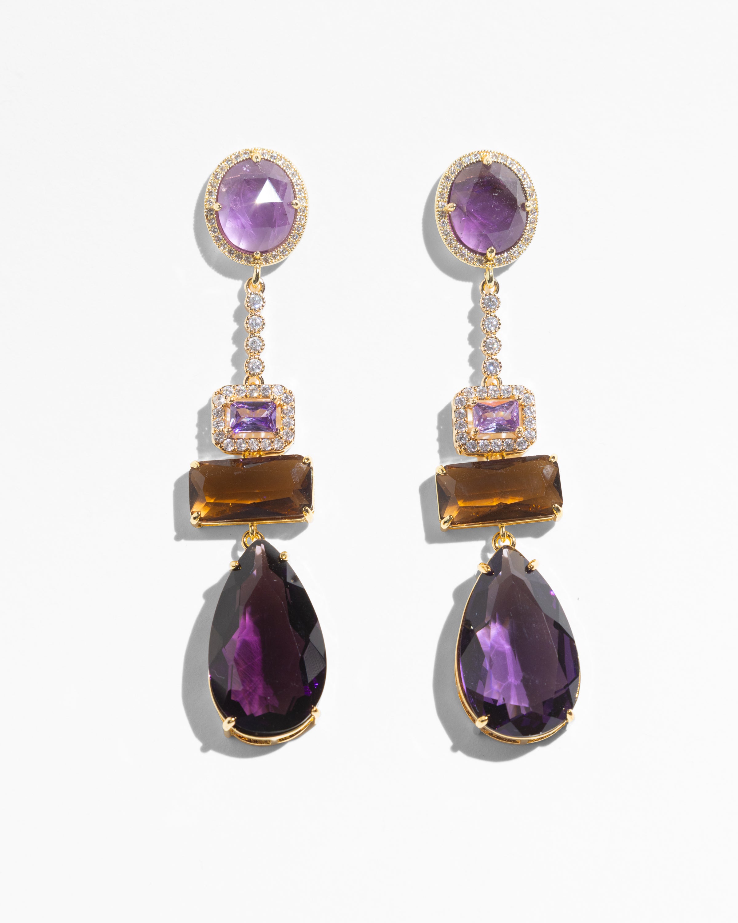 These crystal dangles are all about understated glamour — deep purple, dramatic brown, and clear sparkles stacked in clean, graphic lines. They move beautifully and feel instantly polished, the kind of earrings that make even the simplest outfit look styled.