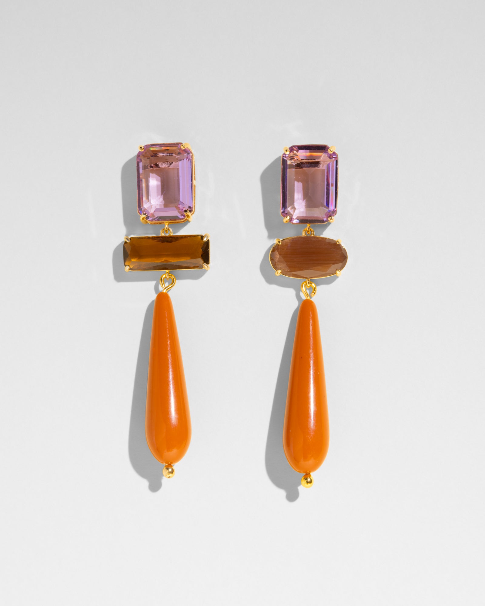 Light and effortless, these earrings balance sparkle and shape with ease. Crystals, faceted cat’s eye slabs, and glossy resin drops come together in a design that feels both feminine and elegant — the kind of pair that instantly elevates your look without ever weighing you down.