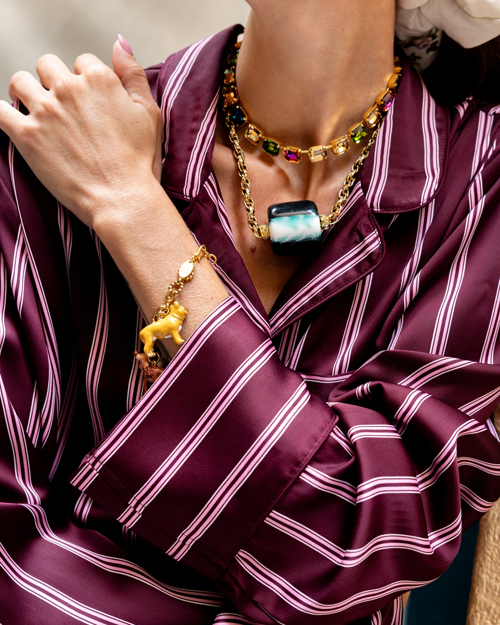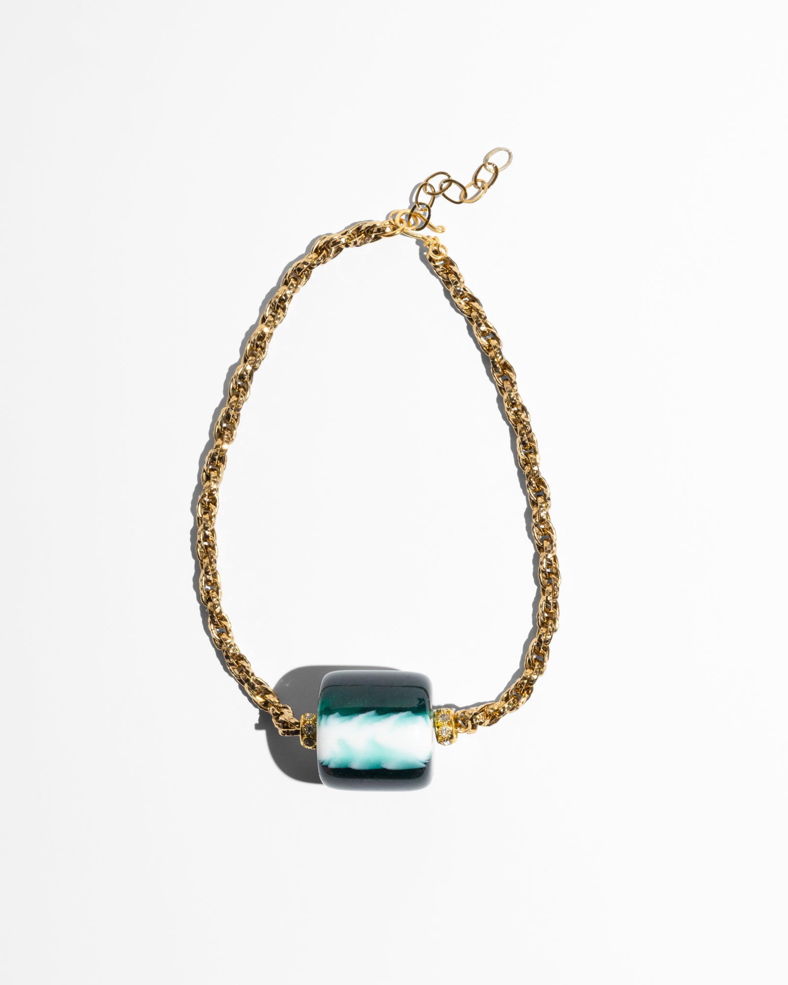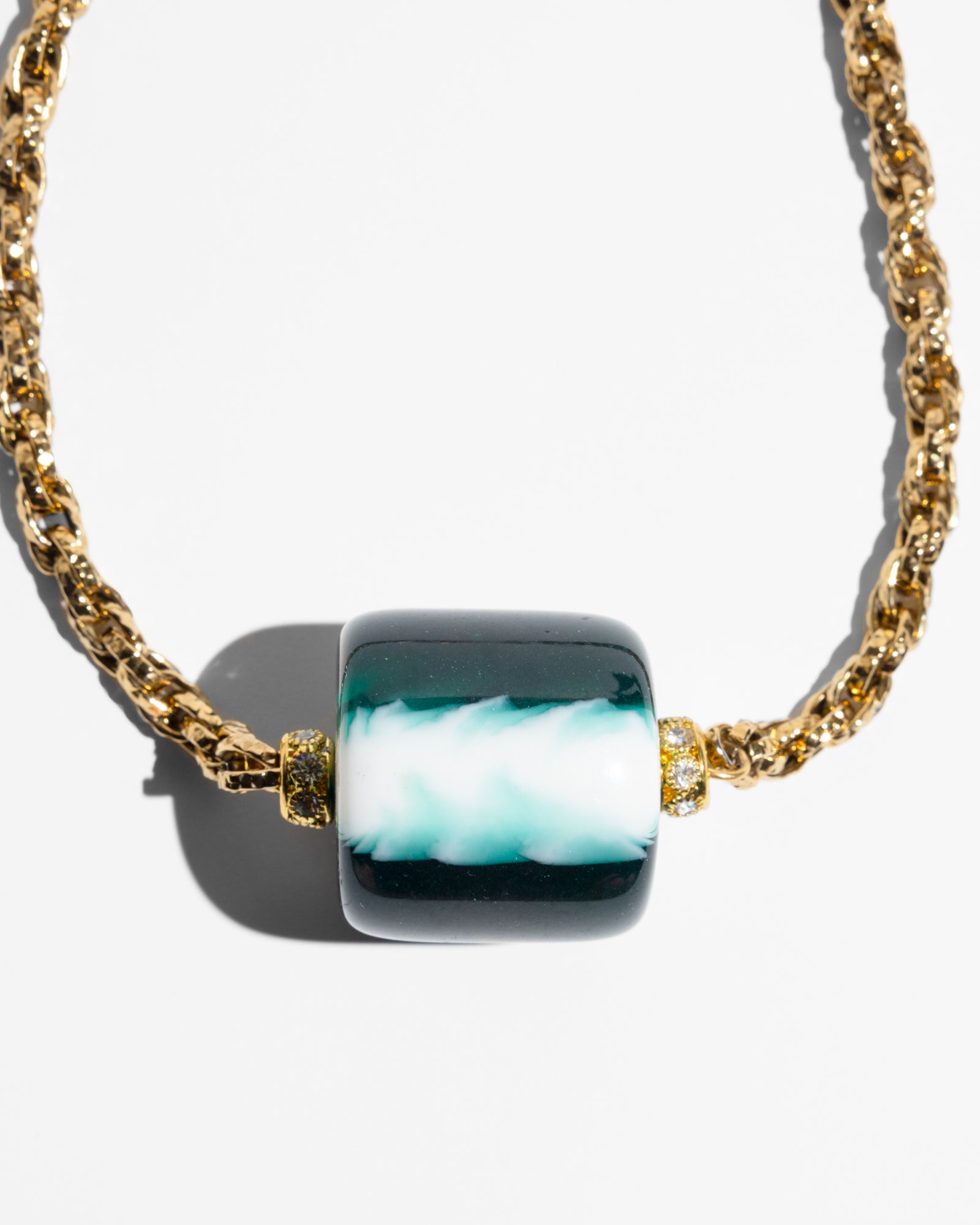 An intricate gold-plated chain holds a striking two-tone resin bead, handpicked by Katerina on her travels. Its deep, mesmerizing green makes it simple yet impressive — the kind of piece that works just as beautifully with a turtleneck as it does with a plunging V-neck.