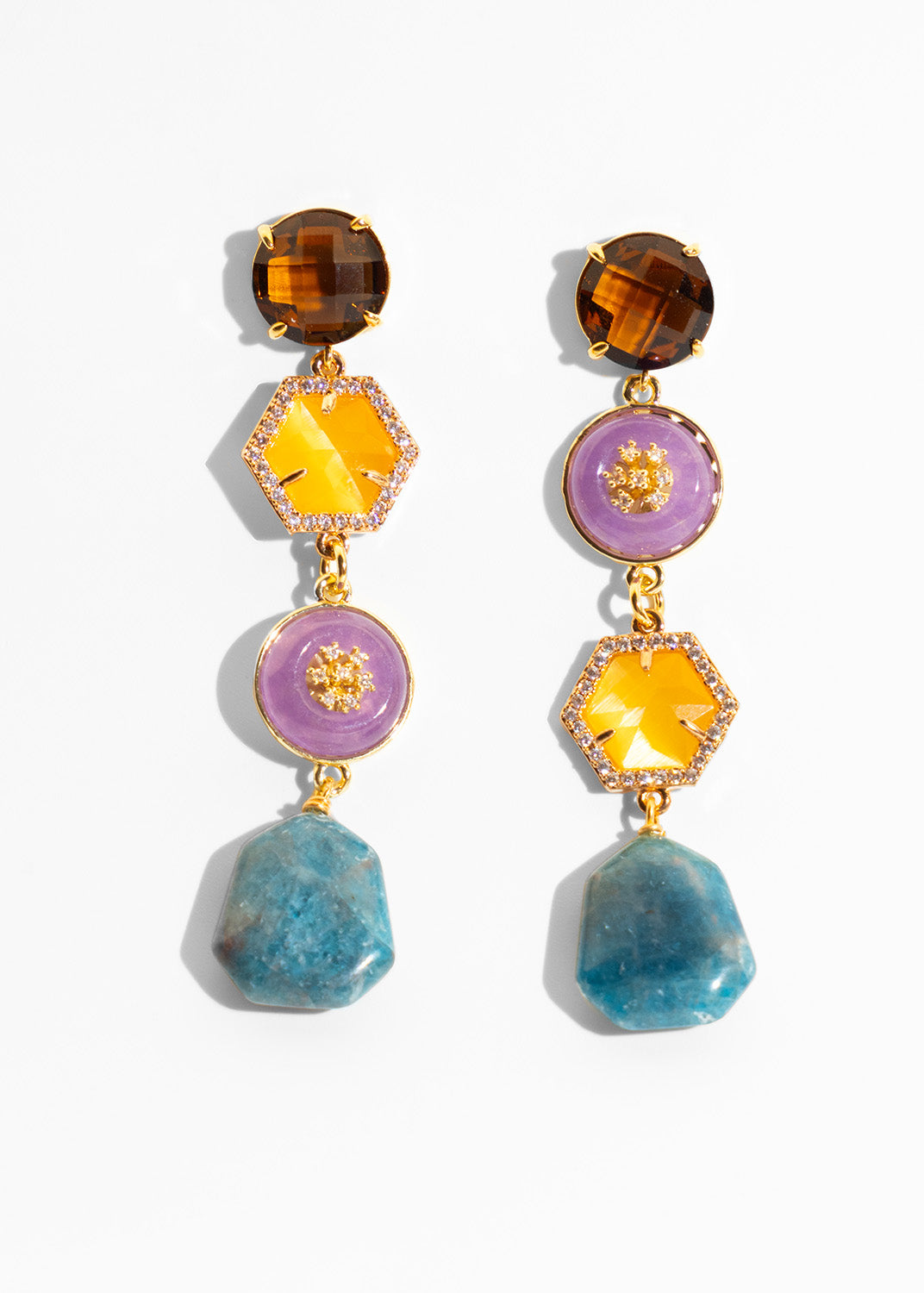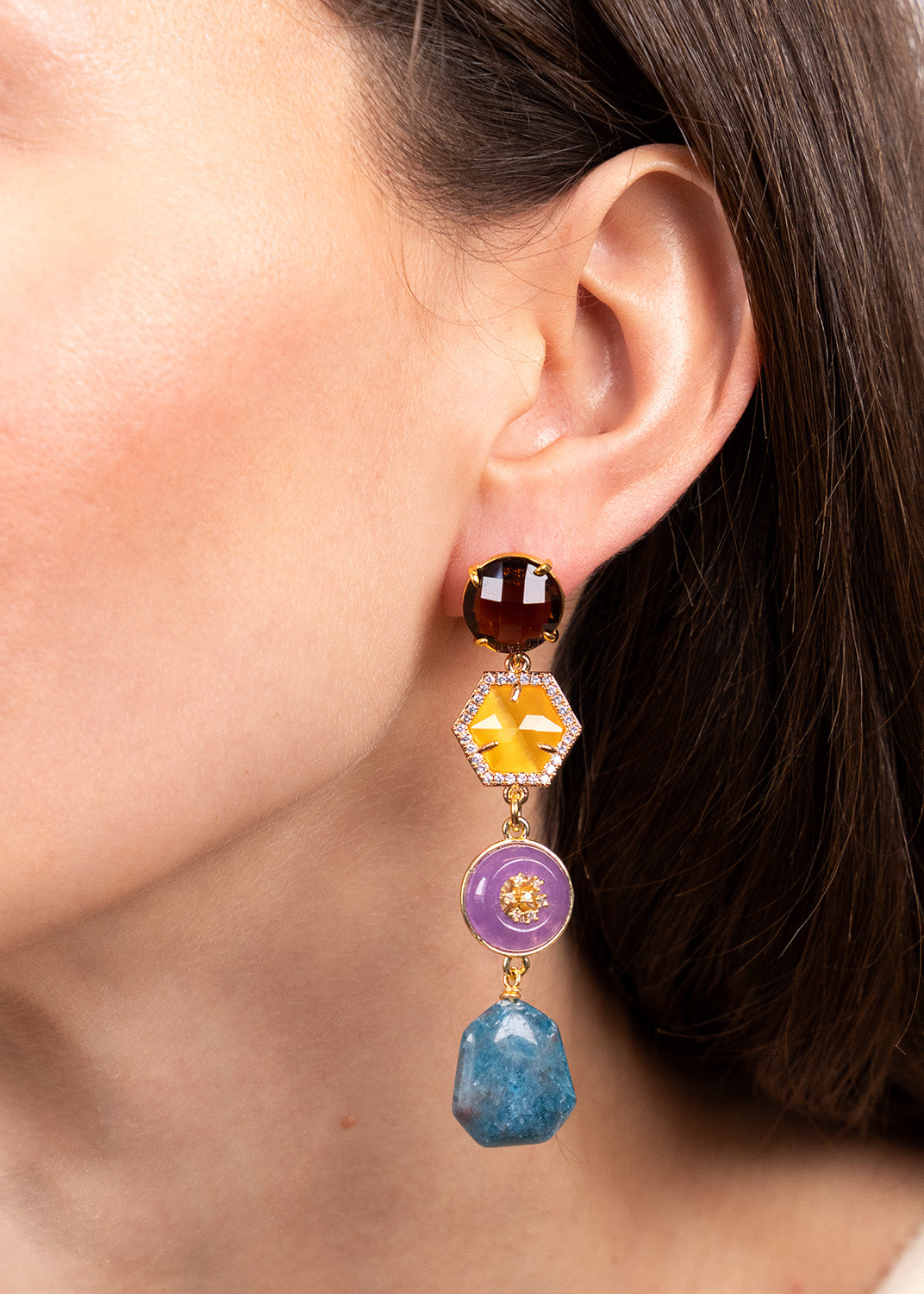 Delicate yet striking, these earrings combine crystals, polished stones, and cat’s eye slabs in a cascade of color and light. Subtle in feel but instantly defining, they frame any look with elegance — that little something that makes your style unmistakably yours