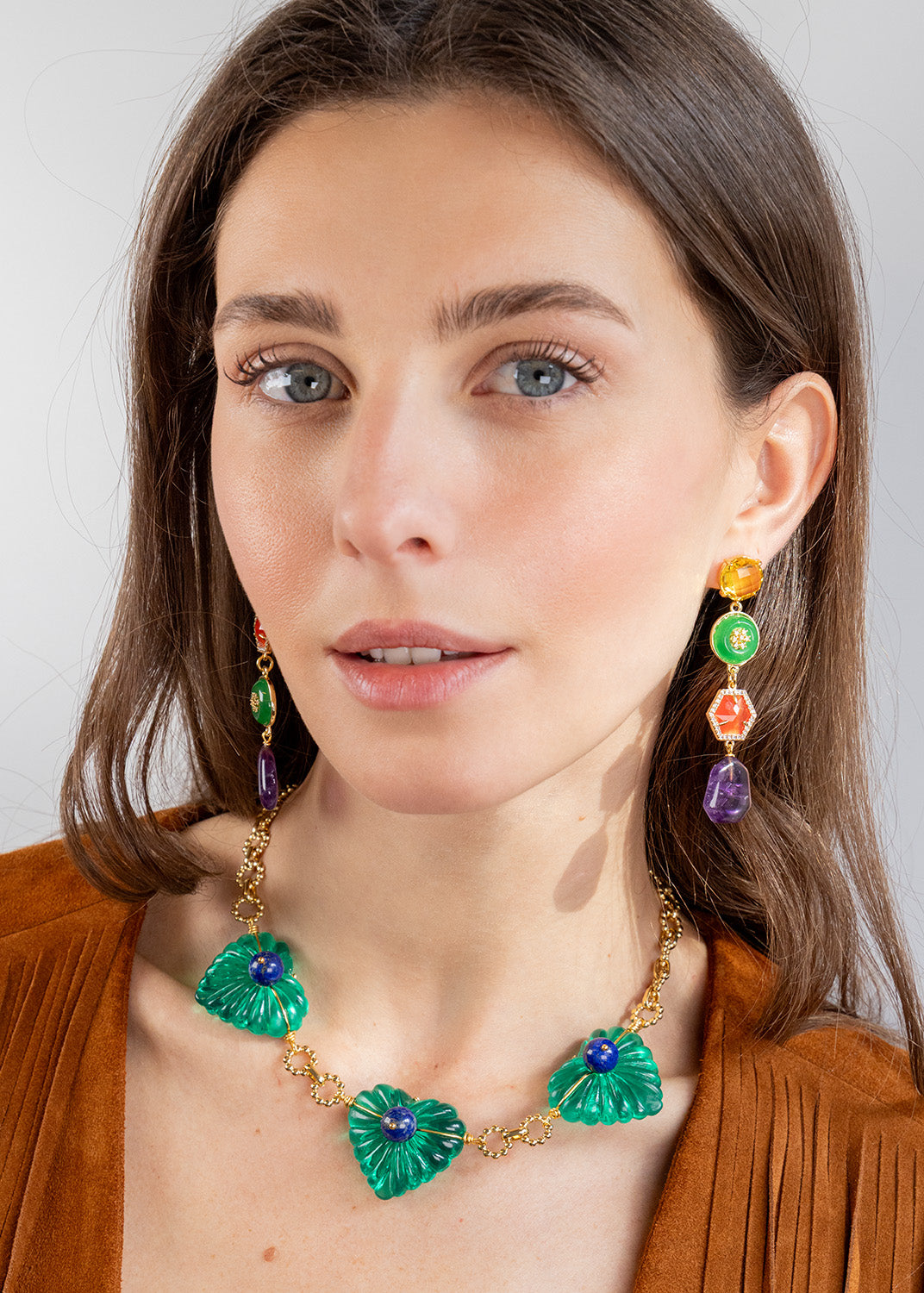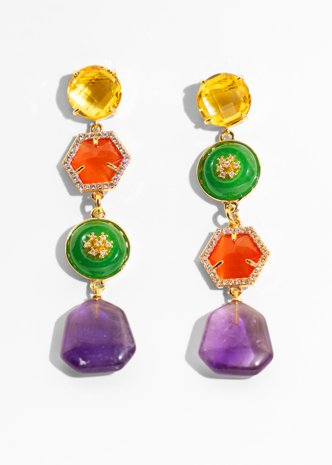 Delicate yet striking, these earrings combine crystals, polished stones, and cat’s eye slabs in a cascade of color and light. Subtle in feel but instantly defining, they frame any look with elegance — that little something that makes your style unmistakably yours