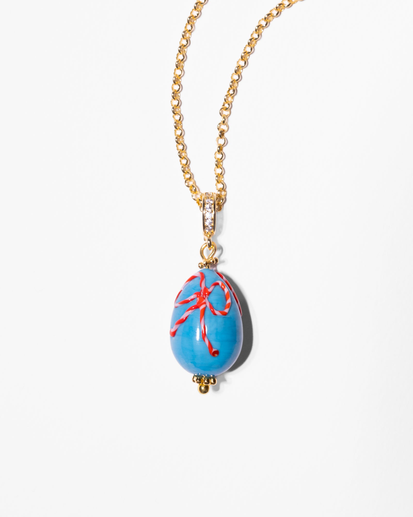 Made in Venice: our Murano eggs are made by glass masters following the "al lume" technique, which is century years old. A little "ritorto" bow made from twisted glass, in red color adorns the polished bead. The egg pendant is set on a sparkling gold plated chain and has a clasp that allows you to remove the bead from the chain.