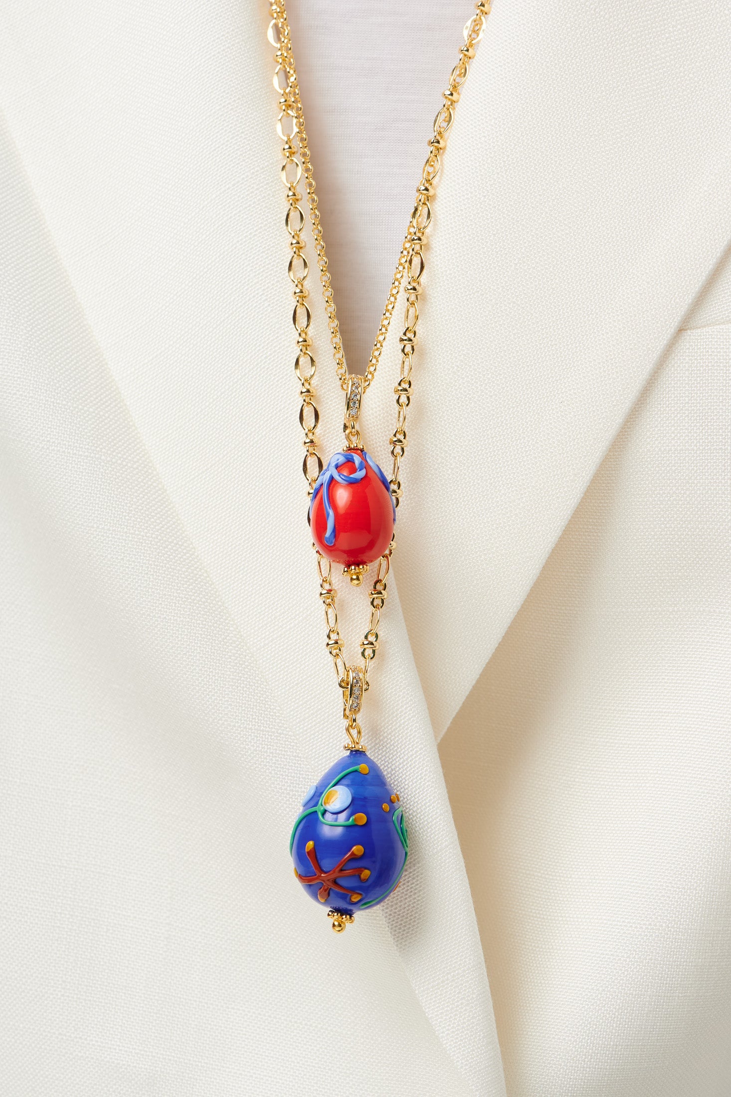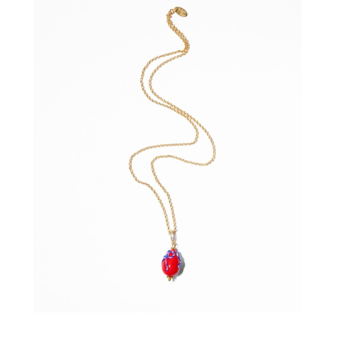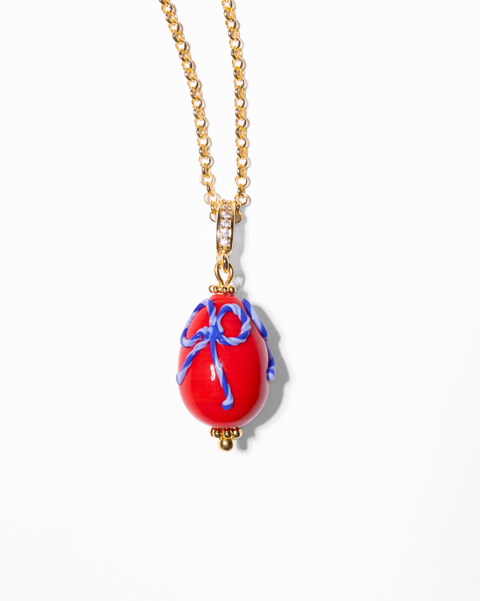 Made in Venice: our Murano eggs are made by glass masters following the "al lume" technique, which is century years old. A little "ritorto" bow made from twisted glass, in blue color adorns the polished bead. The egg pendant is set on a sparkling gold plated chain and has a clasp that allows you to remove the bead from the chain.