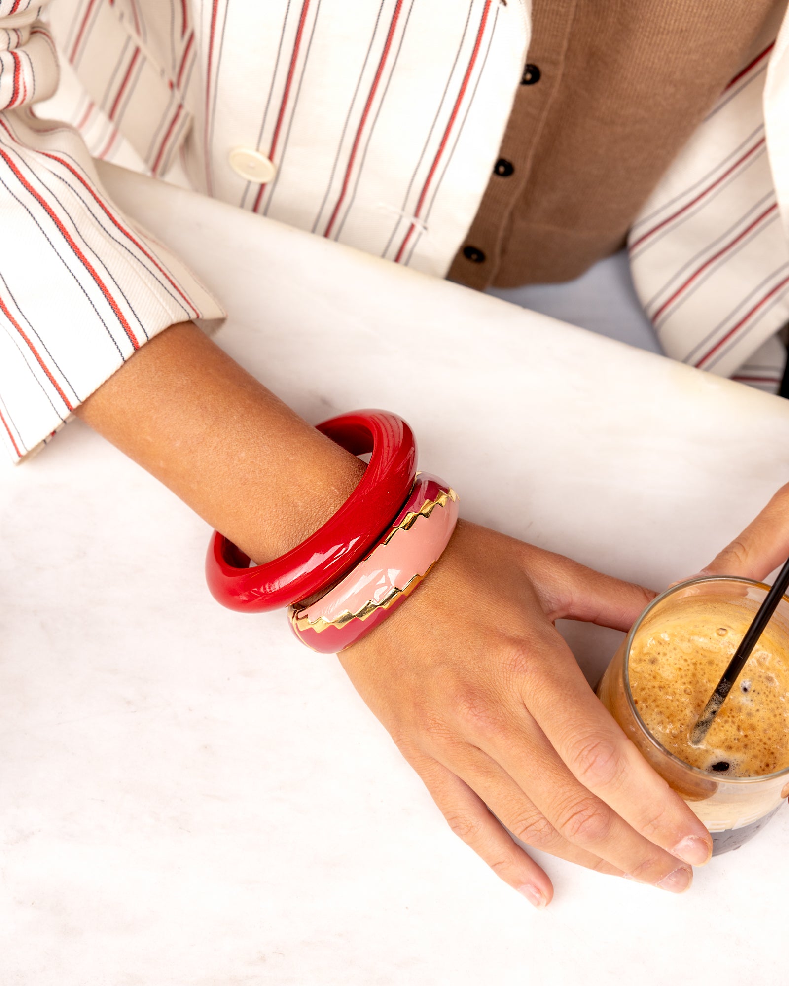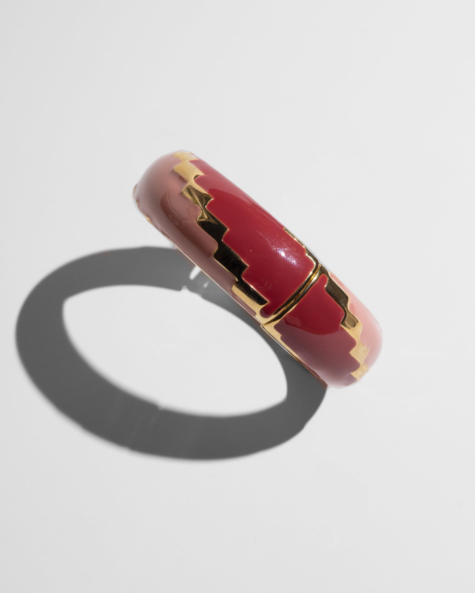 A duo of vintage bangles — one metal, one resin — in rich hues of red and soft pomegranate. They bring just the right touch of color and polish, whether slipped over bare skin in summer or layered atop a cashmere sleeve in winter. Effortless, timeless, and quietly striking.