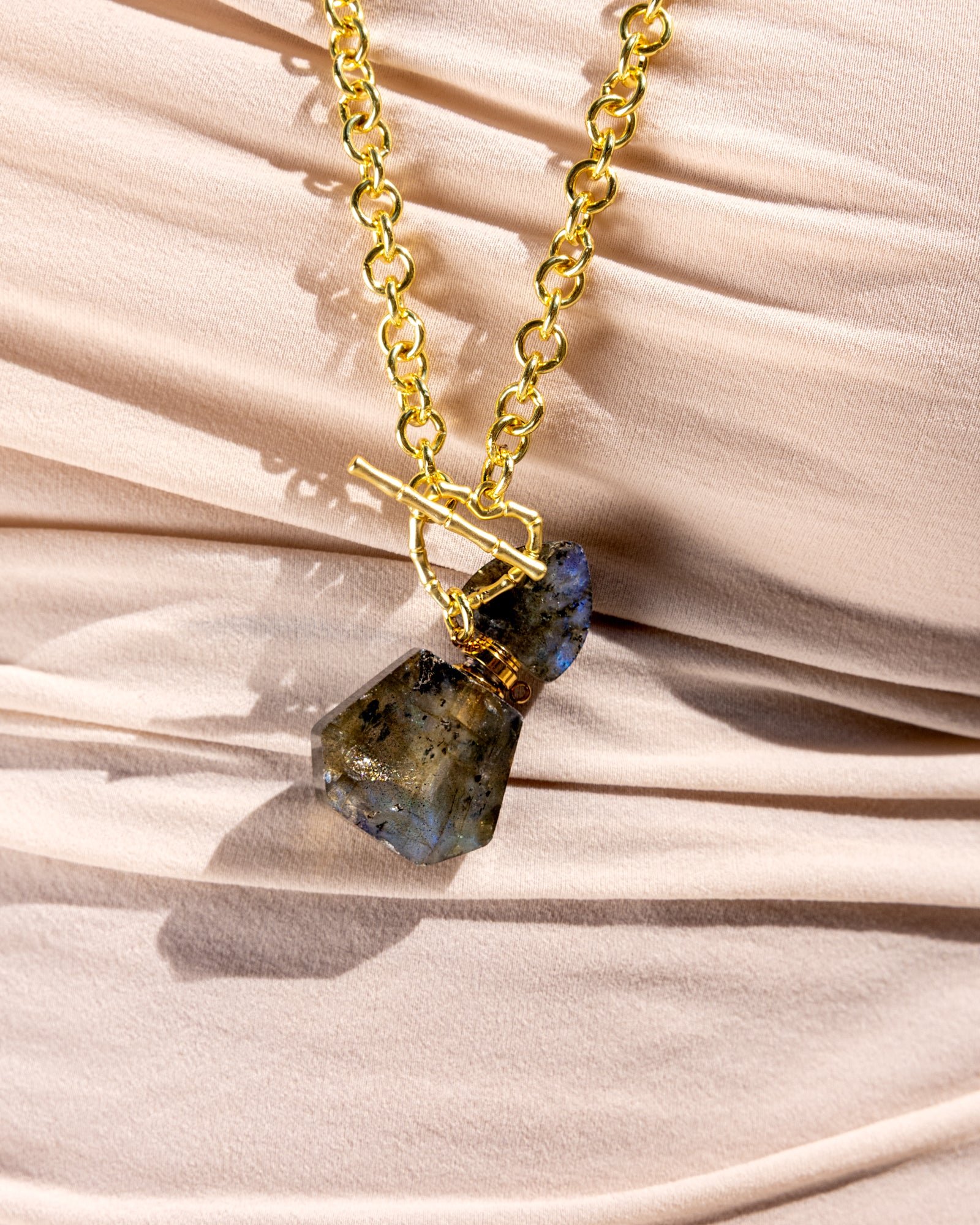Our latest obsession? Our enchanting bottle pendants. Set on a gold-plated chain with a heart-shaped toggle clasp, each one suspends a charming semiprecious stone bottle — and yes, it really opens. This one features a carved labradorite, a stone of shifting light, prized for its iridescent flashes of blue and green. Worn long or doubled into two rows, it’s a piece that feels both playful and refined. Of course, the name hints at secrets and potions :)