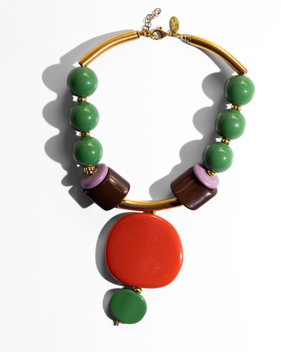 This necklace is pure statement — colorful resin and acrylic beads meet gold-plated accents in a bold, sculptural form. Light in weight yet impossible to miss, it’s the kind of statement piece that turns simplicity into style.