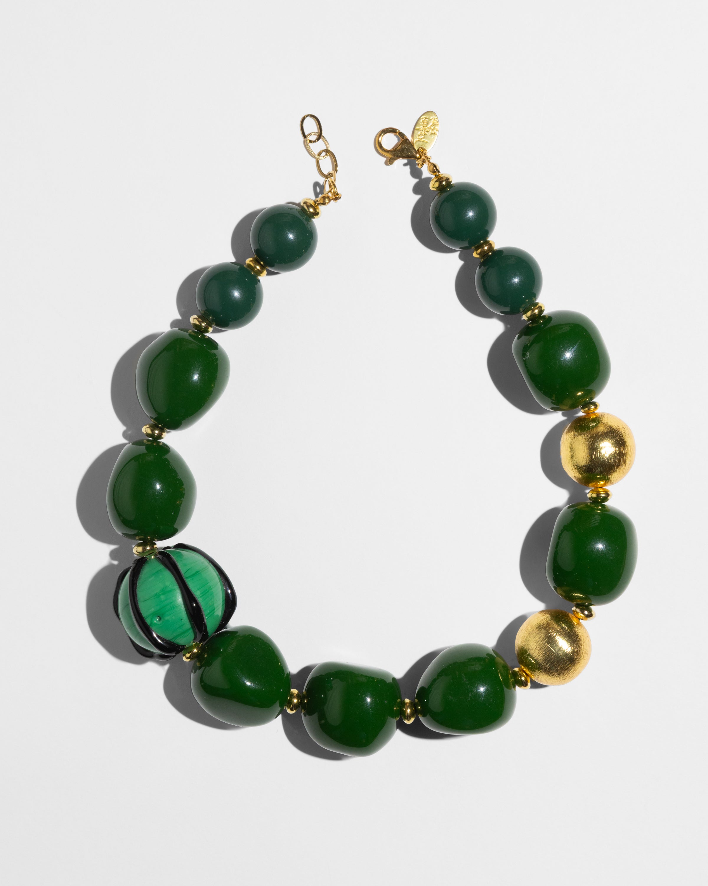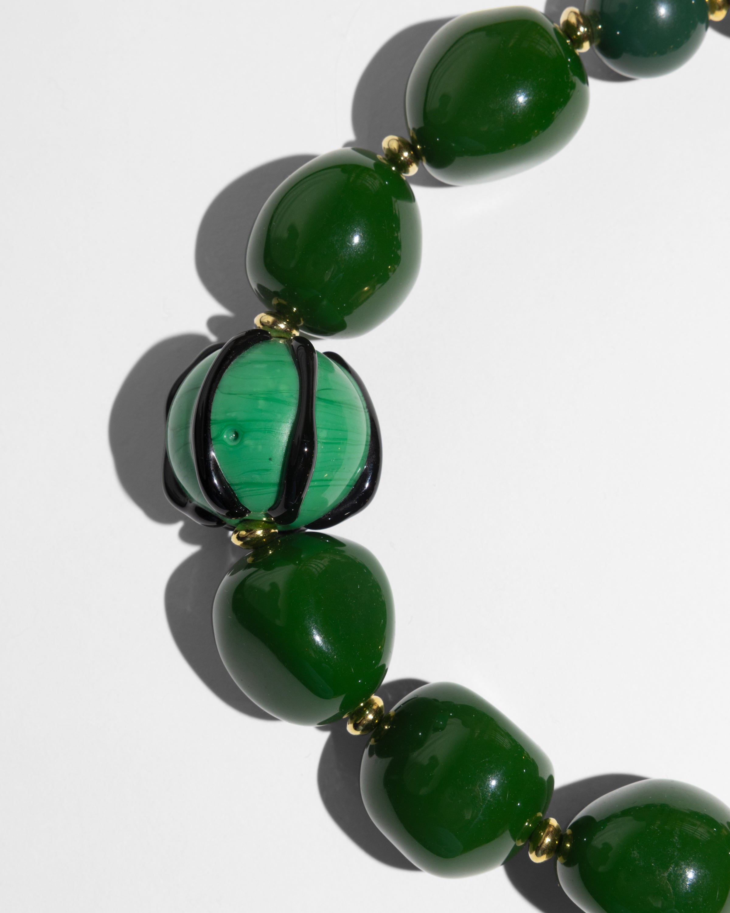 A piece that feels effortlessly chic — glossy green lacquered beads meet a handmade Murano bead from venice. Bold but incredibly wearable, it brings a fresh pop of color and texture to any look. One of those necklaces that does the styling for you.