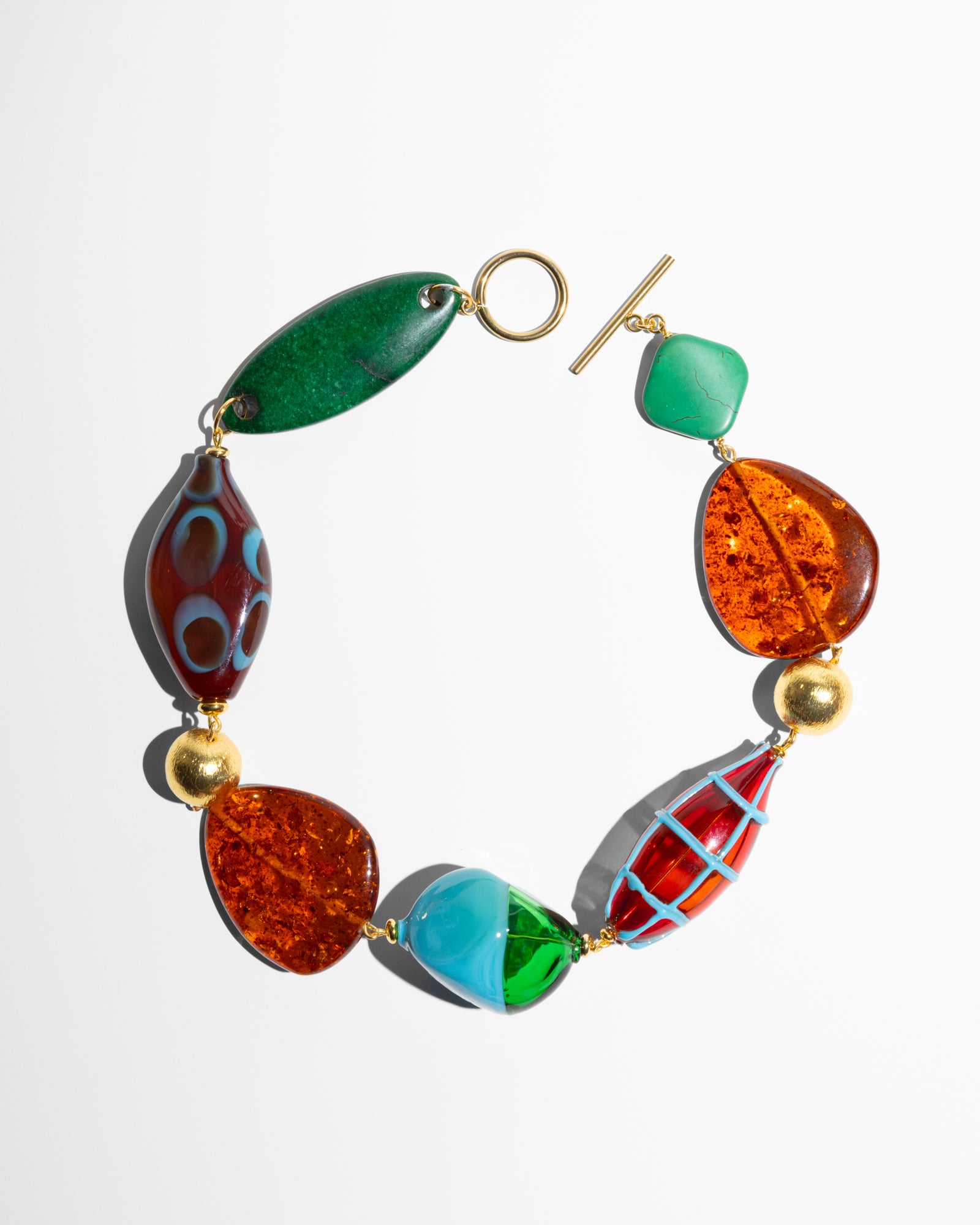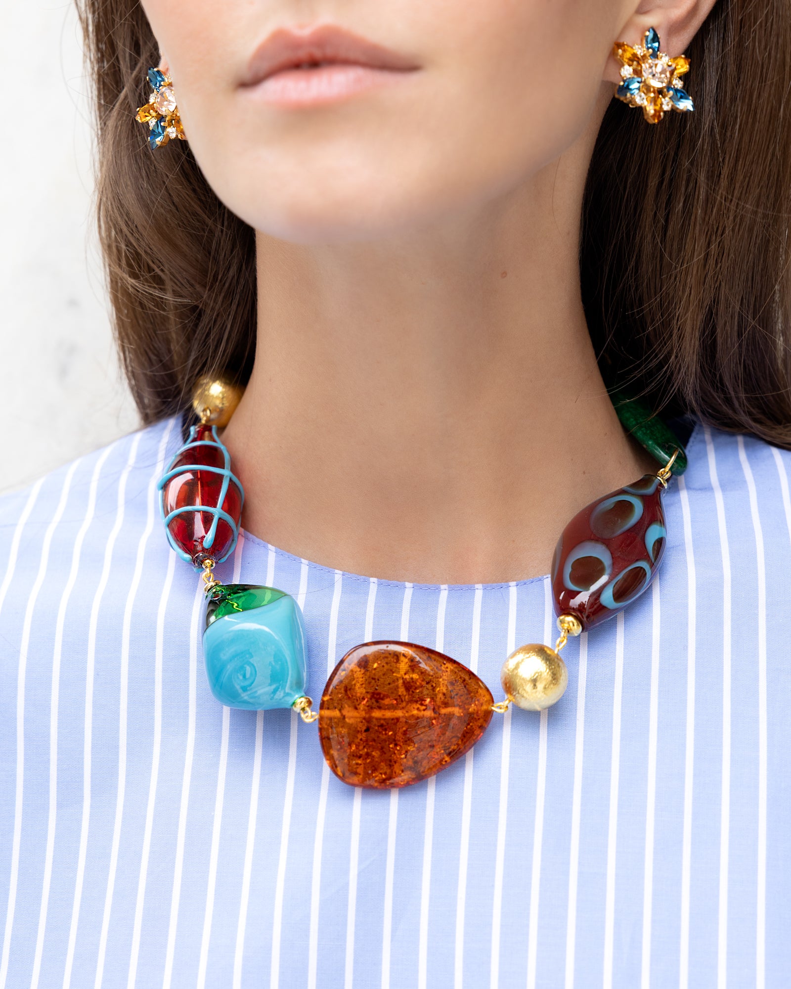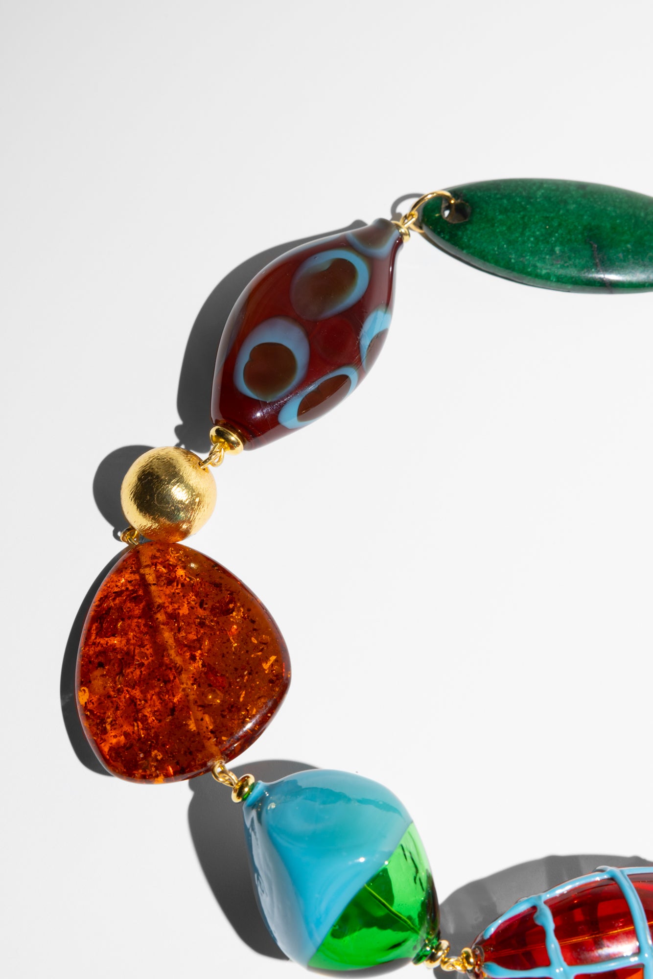 An artful mix of Murano glass beads and semiprecious stones, this necklace carries a feeling of preciousness and craftsmanship. Each element is handpicked and full of character, creating a composition that feels both spontaneous and refined. A unique piece that makes elegance feel effortless.