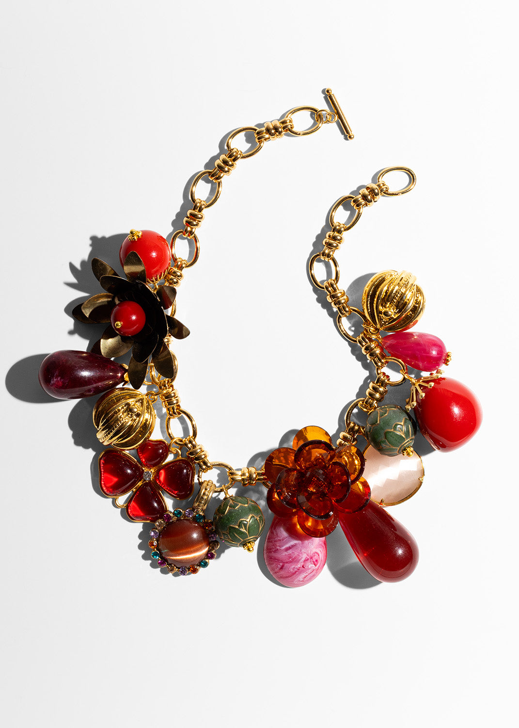 - Materials: vintage acrylic drops, beads and flowers, gold plated beads