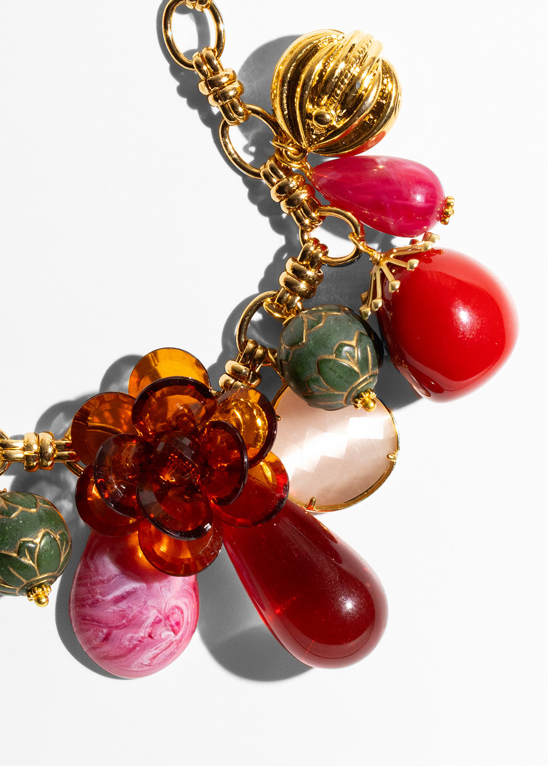 The Olivia short chain necklace mixes vintage acrylic drops, leaves, and a metal flower into something truly special. It looks bold but feels light, so you’ll forget you’re wearing it—until the compliments start. The soft lilacs, cool blues, and elegant greens blend beautifully together. It’s the kind of piece that instantly pulls a look together, effortlessly.