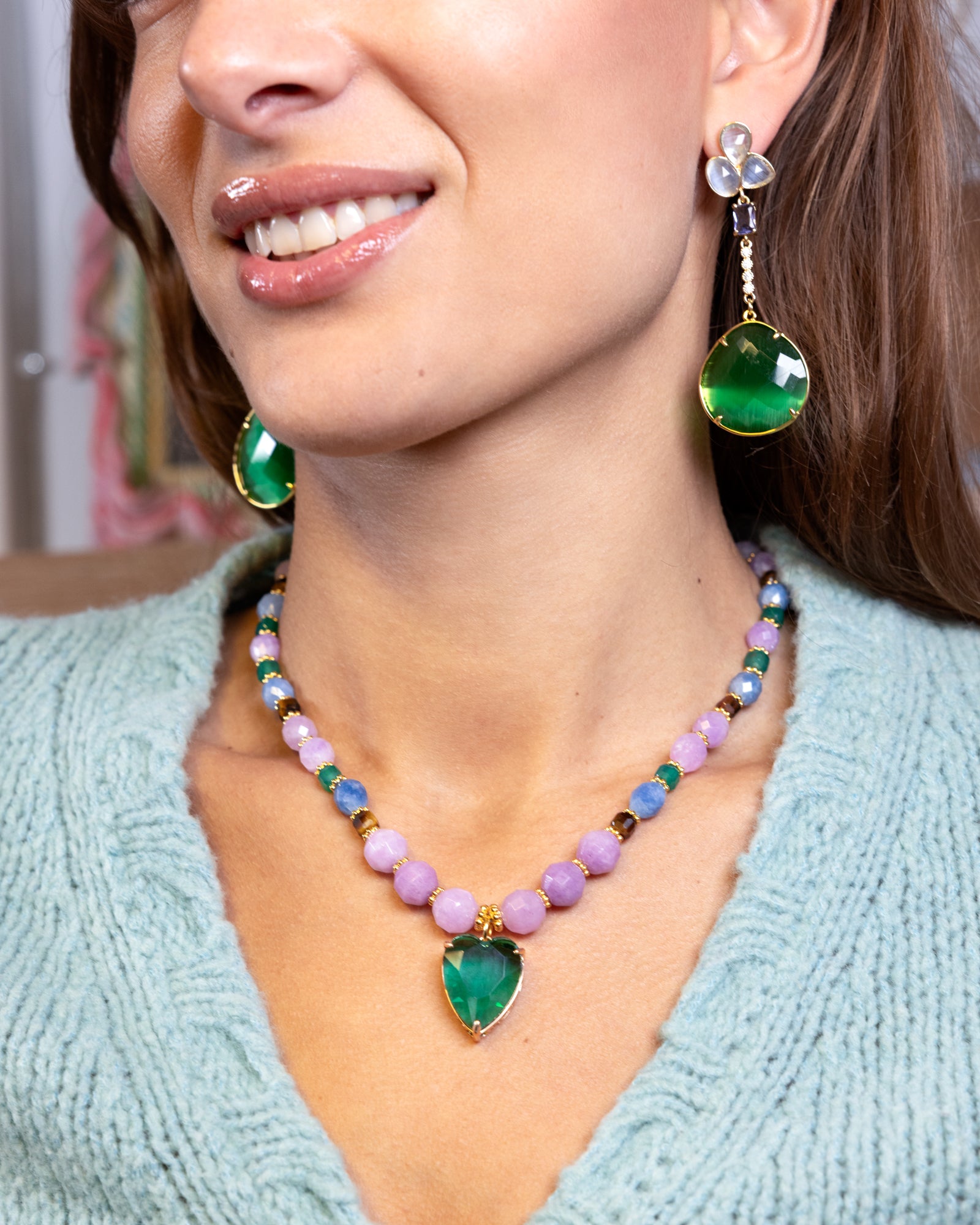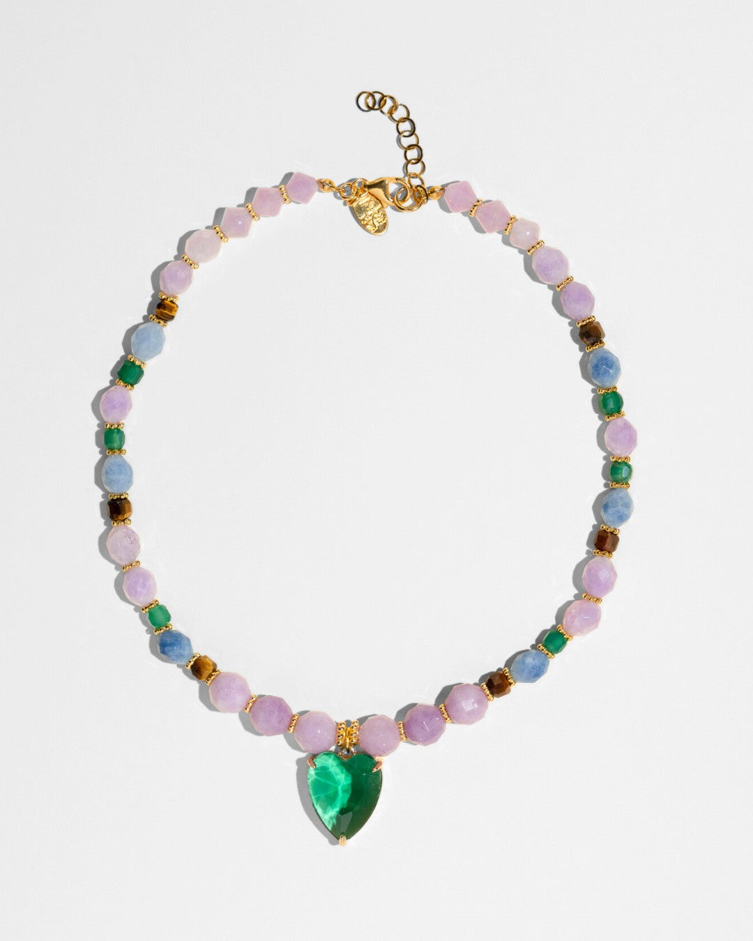 This necklace is pure joy to wear — colorful, light, and full of personality. At its center, a crystal heart sparkles softly. The top part mixes semiprecious stones in rich, vibrant shades that make every outfit feel a little more special. It’s that perfect piece to brighten your day — and your look.