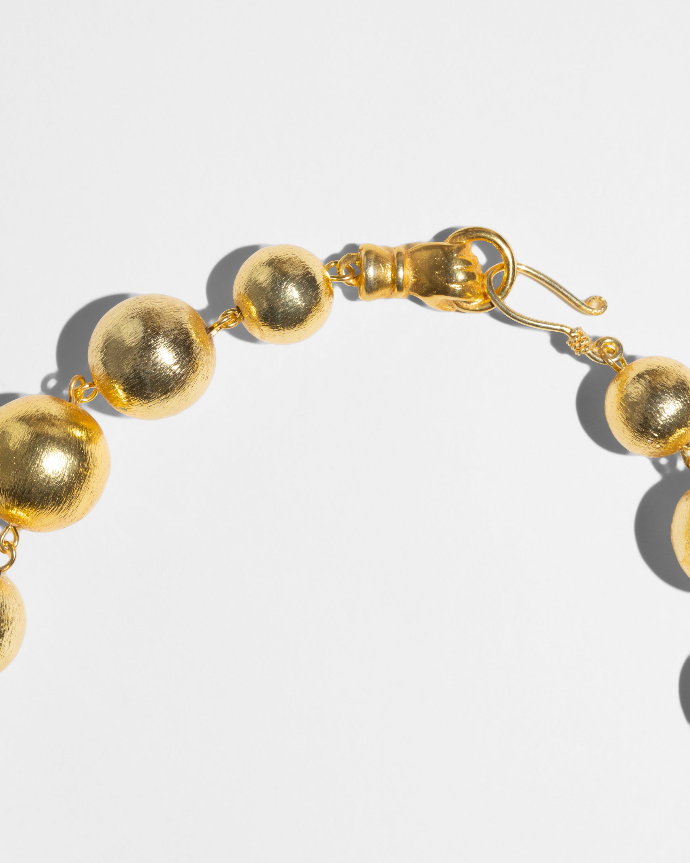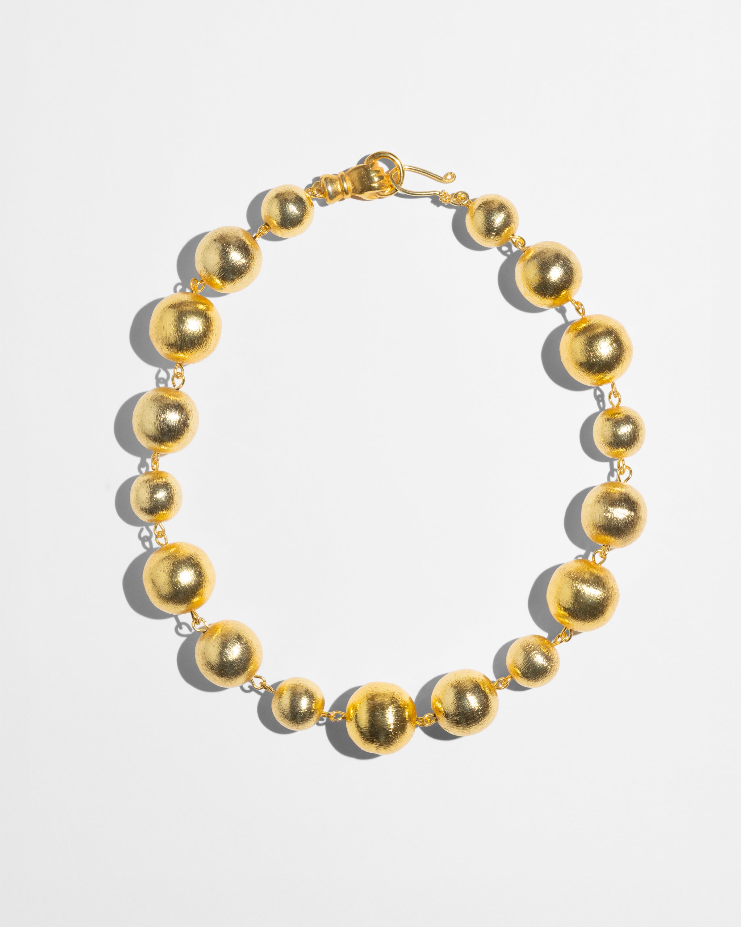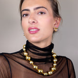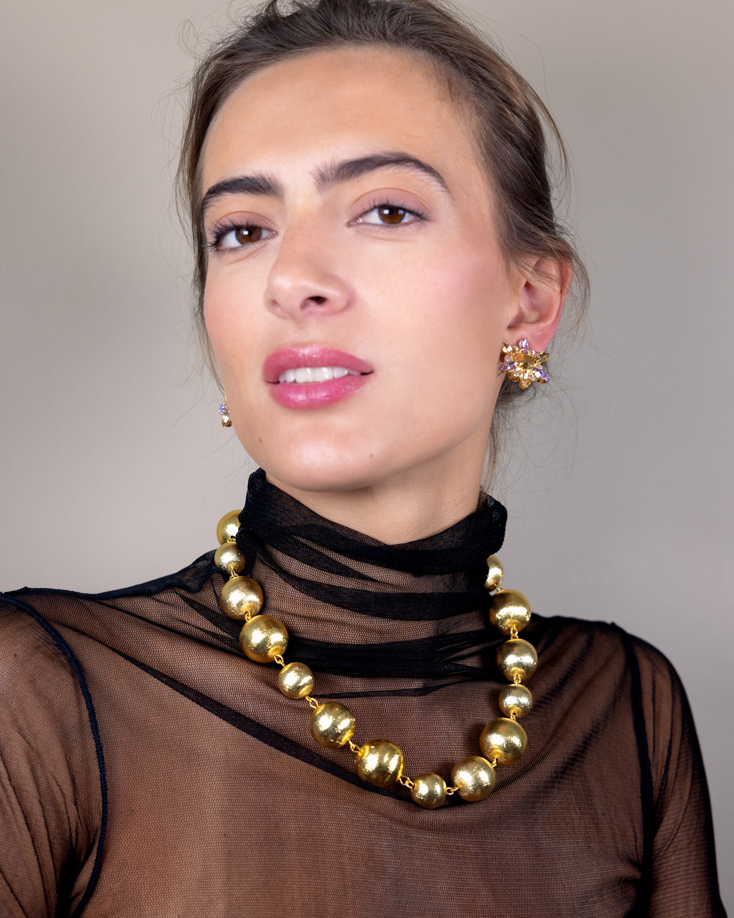 Crafted with meticulous attention to detail, this necklace unites the warmth of gold-plated Indian beads with the ethereal glow of white crystals. The result is a piece of quiet elegance that enhances any ensemble with refined restraint. Its featherweight construction ensures comfort throughout the day, while its striking visual presence elevates both casual and formal occasions with an air of cultivated sophistication.