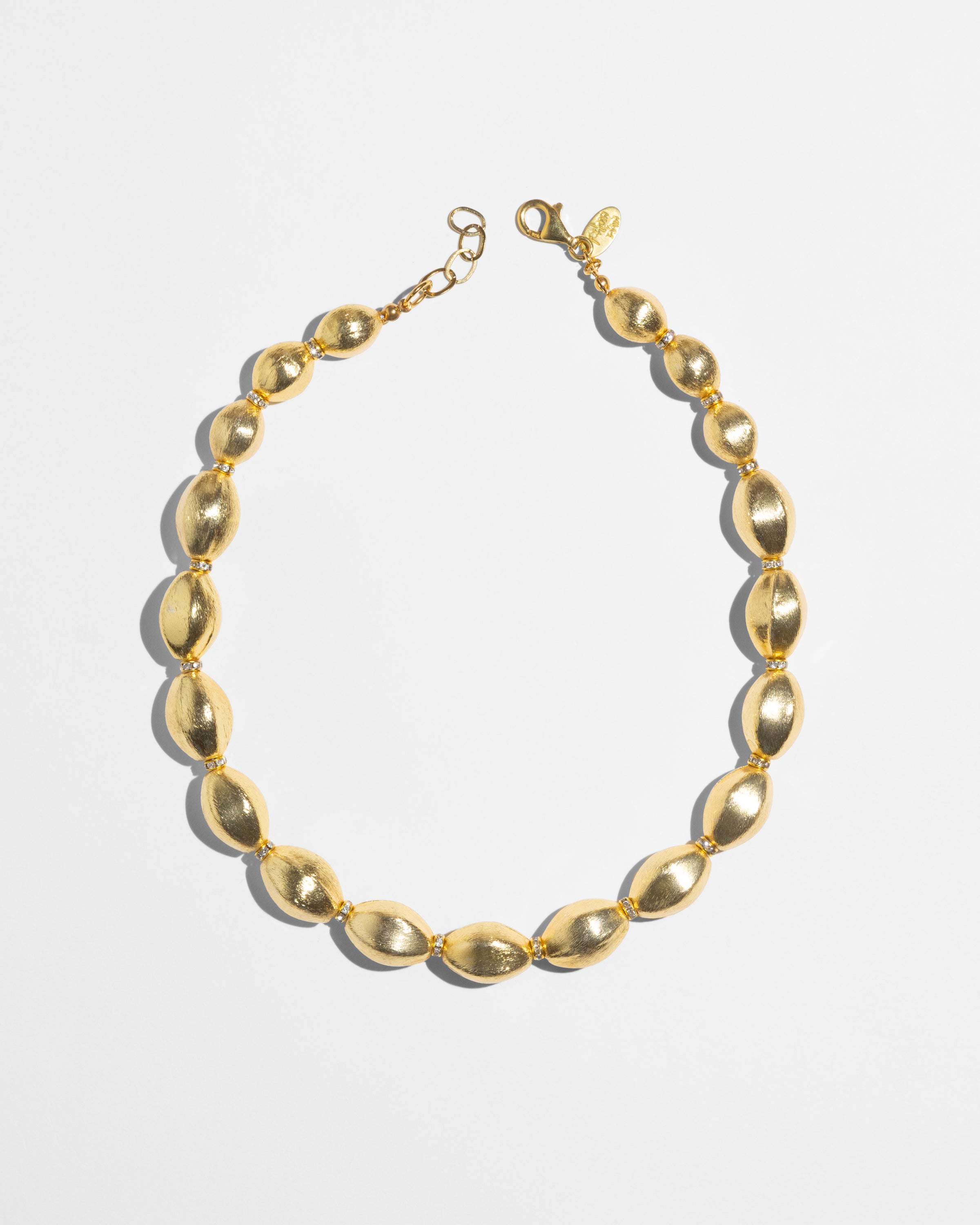 Crafted with meticulous attention to detail, this necklace unites the warmth of gold-plated Indian beads with the ethereal glow of white crystals. The result is a piece of quiet elegance that enhances any ensemble with refined restraint. Its featherweight construction ensures comfort throughout the day, while its striking visual presence elevates both casual and formal occasions with an air of cultivated sophistication.