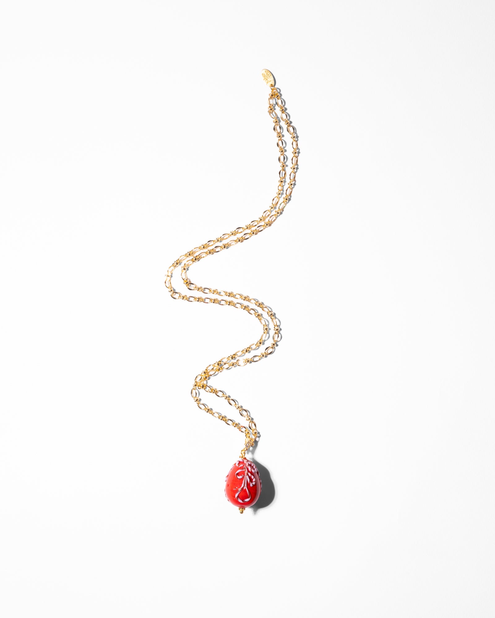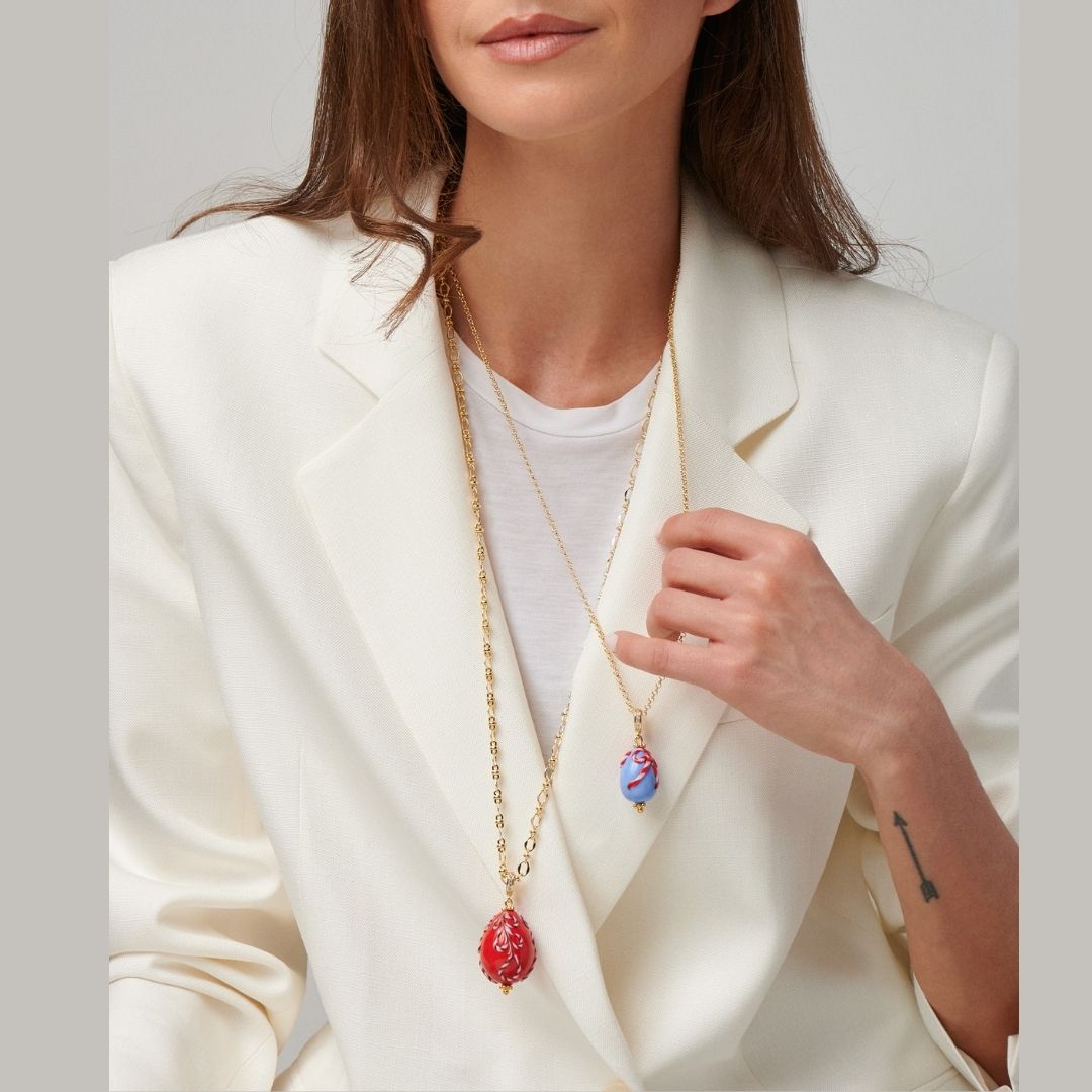 Made in Venice: our Murano eggs are made by glass masters following the "al lume" technique, which is century years old. A little "ritorto" motif made from twisted glass, in brown and white colors adorns the polished bead. The egg pendant is set on a sparkling gold plated chain and has a clasp that allows you to remove the bead from the chain.