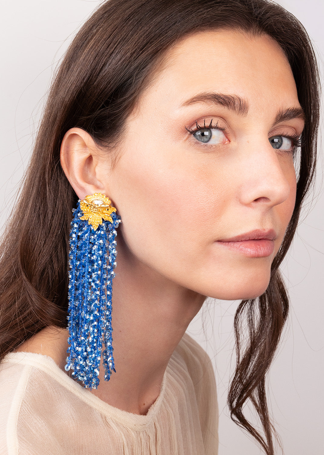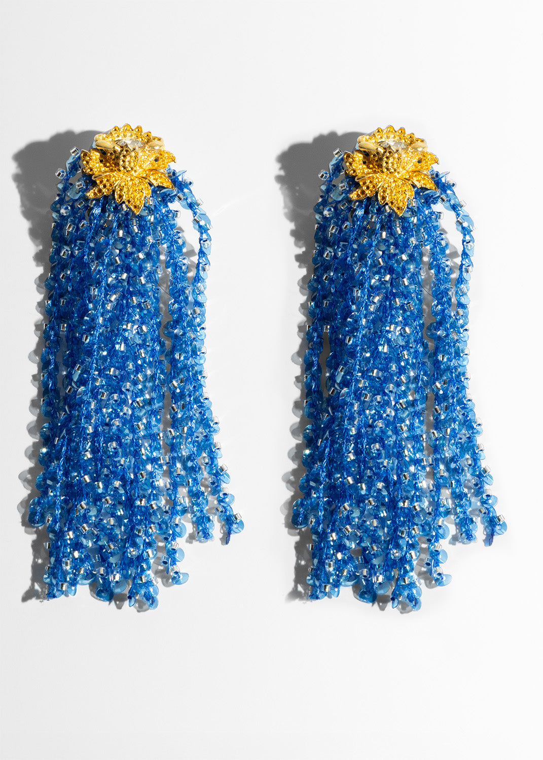 These earrings refuse to go unnoticed — cascades of shimmering blue sequins fall from a gold floral stud, creating movement and light with every step. They feel dramatic yet surprisingly wearable, the kind of pair you reach for when you want your look to say a little more. Statement, yes — but in the chicest possible way.