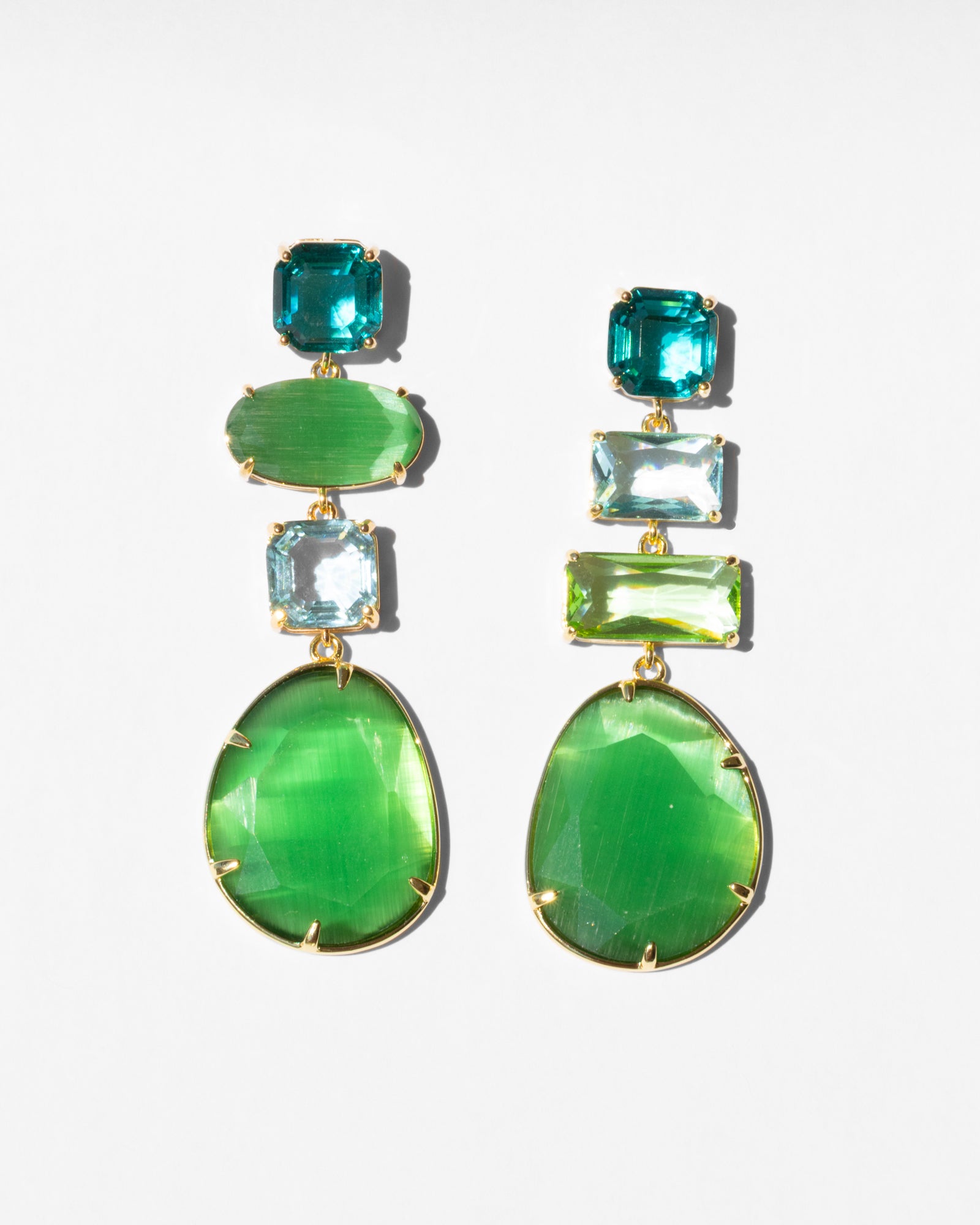 Crafted to perfection, this pair features a cascade of shimmering green faceted cat's eye slabs and crystals that can easily be dressed up or down. Lightweight and comfortable, try them with a total jean look for Sunday brunch or off-shoulder mini dress for a night out.