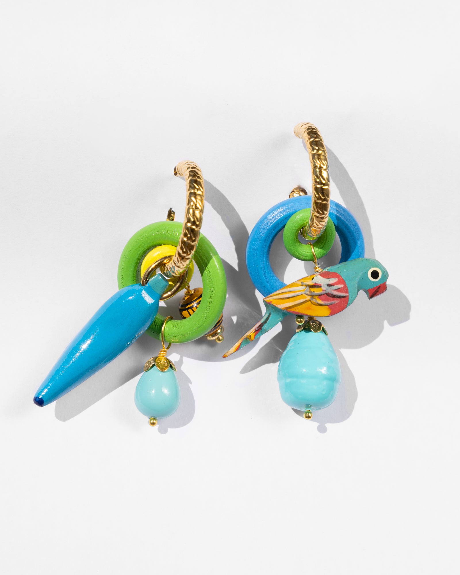 These are pure fun with attitude. Colored wooden hoops, adorned with vibrant beads and hand-painted wooden parrots, rest on twisted metal hoops for an unexpected silhouette. Playful yet distinctive, they bring a sense of nonchalance to any outfit and set the tone for the season.