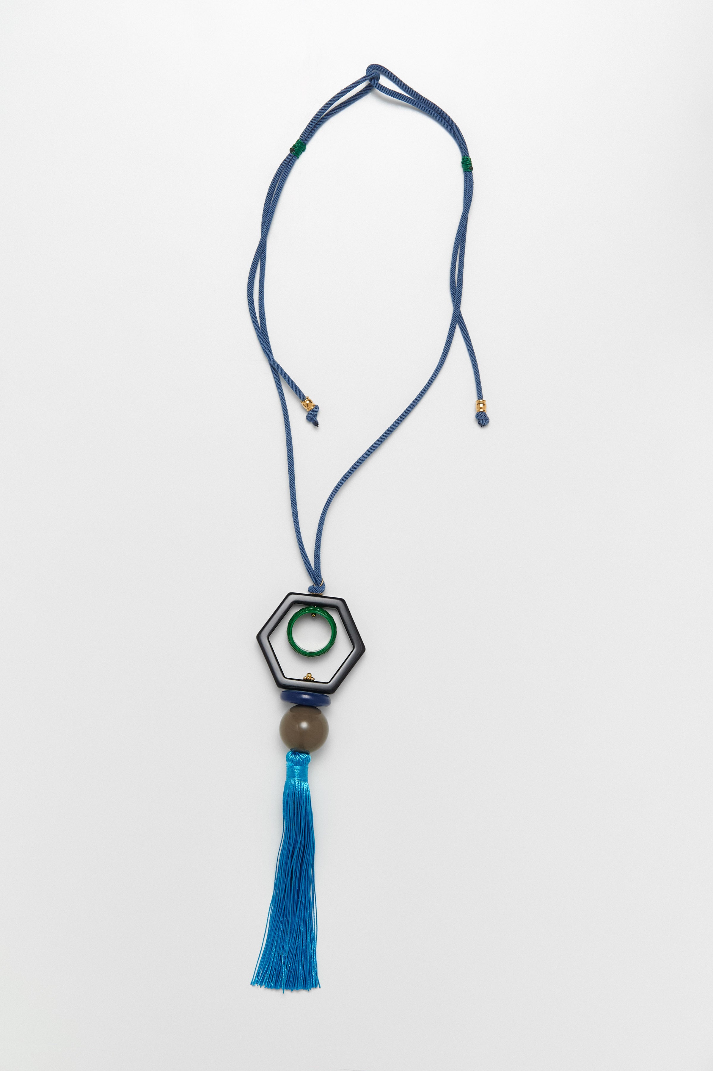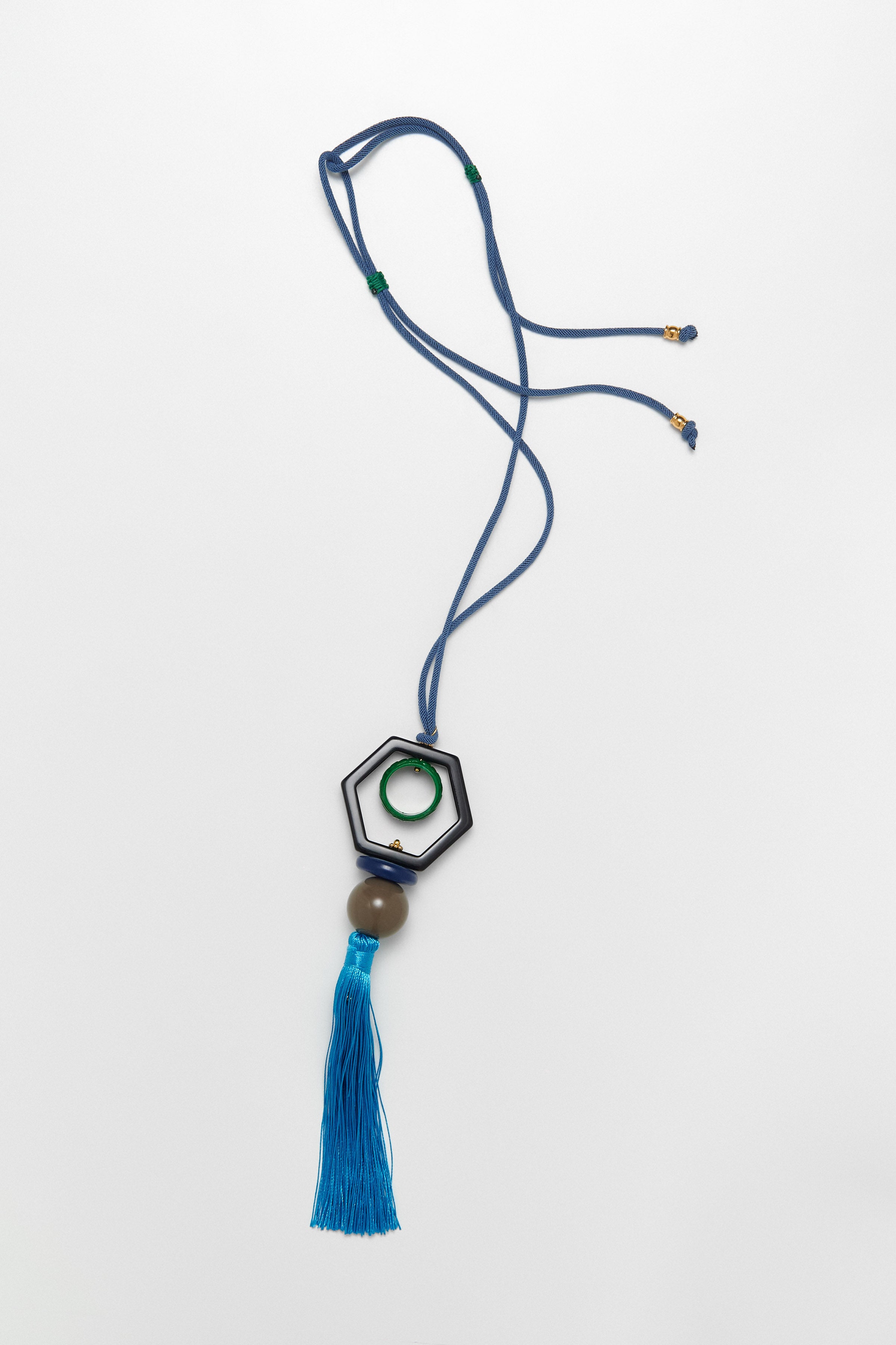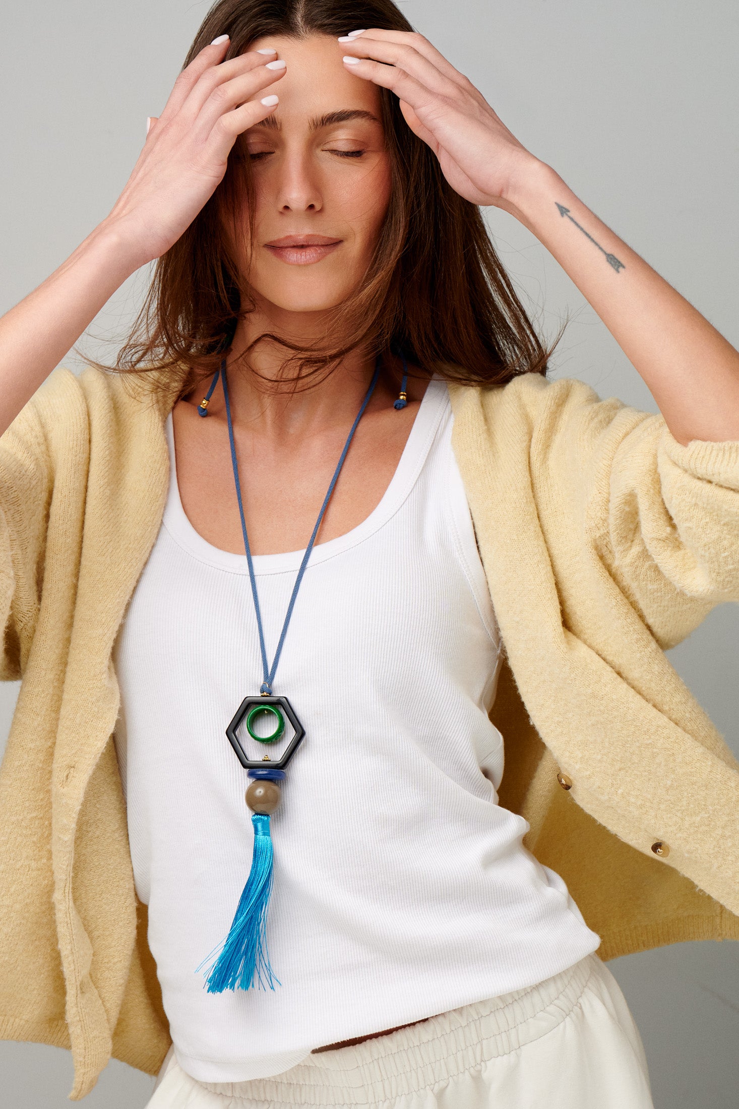 Have you noticed how good a long cord necklace can look when everything else is simple? This one mixes a soft fabric cord with bold geometric stones and a vibrant tassel, creating a piece that feels fresh, graphic, and very modern. It’s the kind of necklace you throw over a shirt, a knit, or a dress when you want a strong, effortless line that pulls the whole look together.