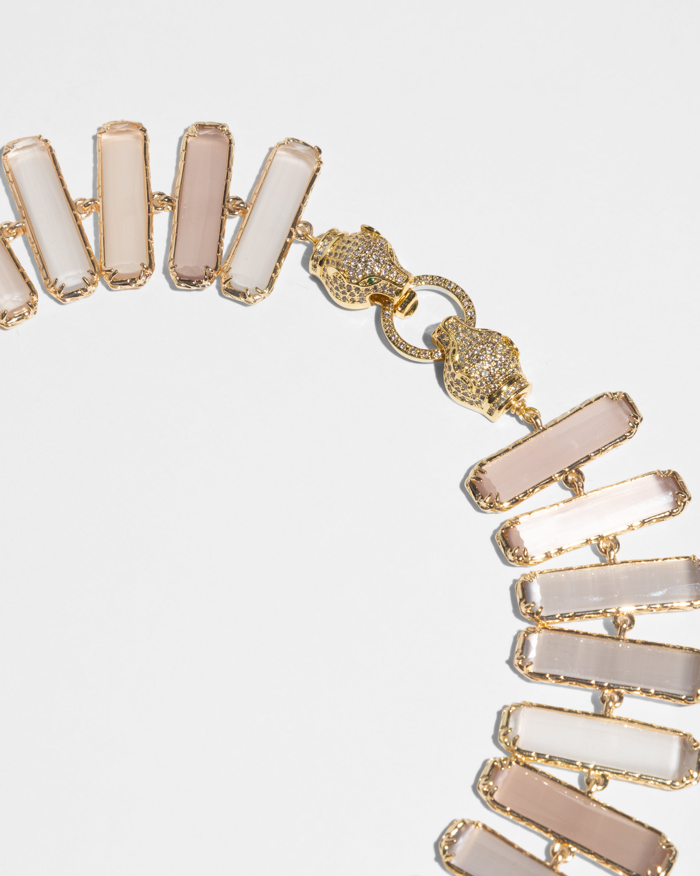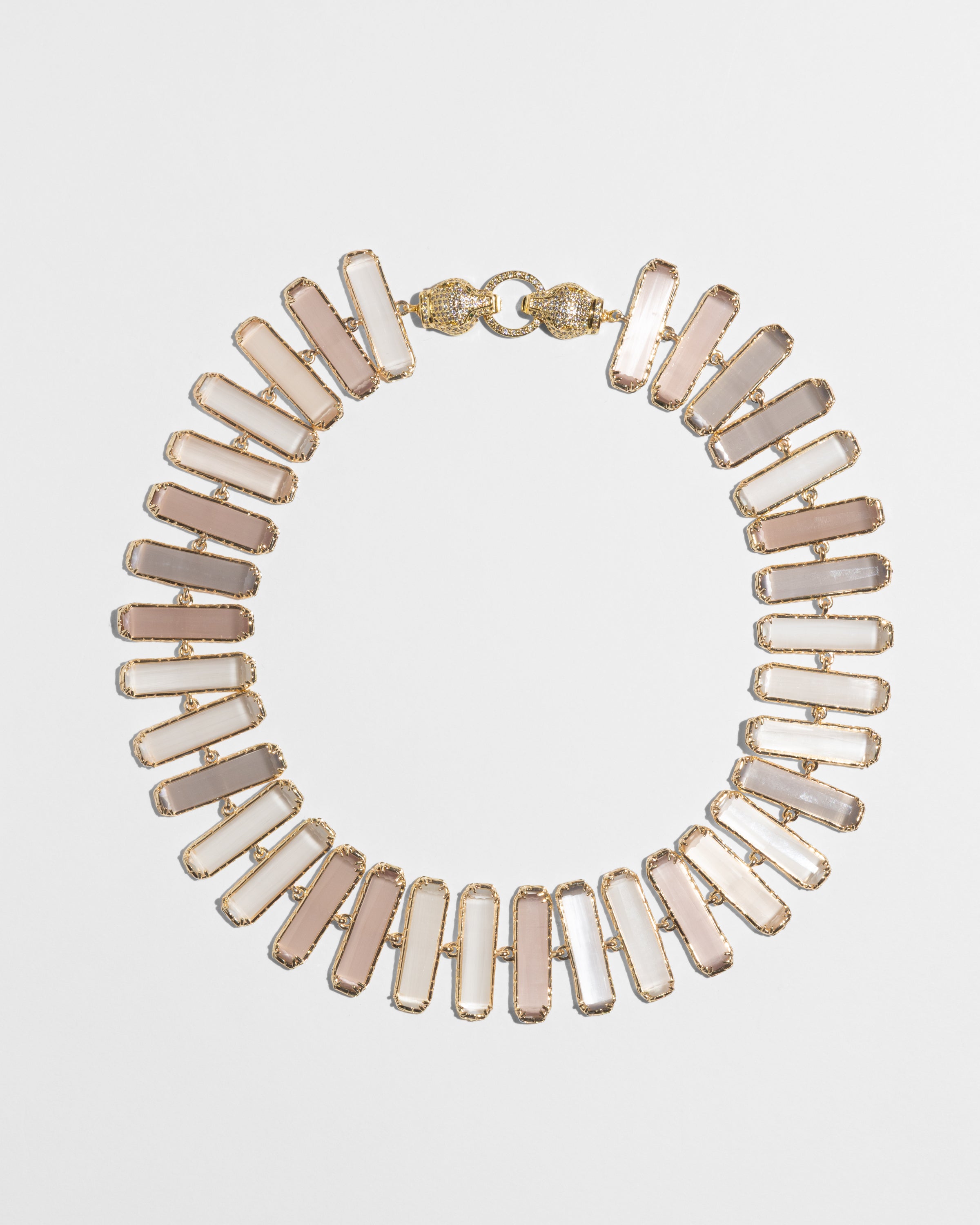 The Luccia Short Necklace showcases hand-selected faceted cat's eye slabs in a refined collar that speaks to understated luxury. Equally suited to daylight moments and evening affairs, this piece brings a touch of polished elegance to any ensemble.