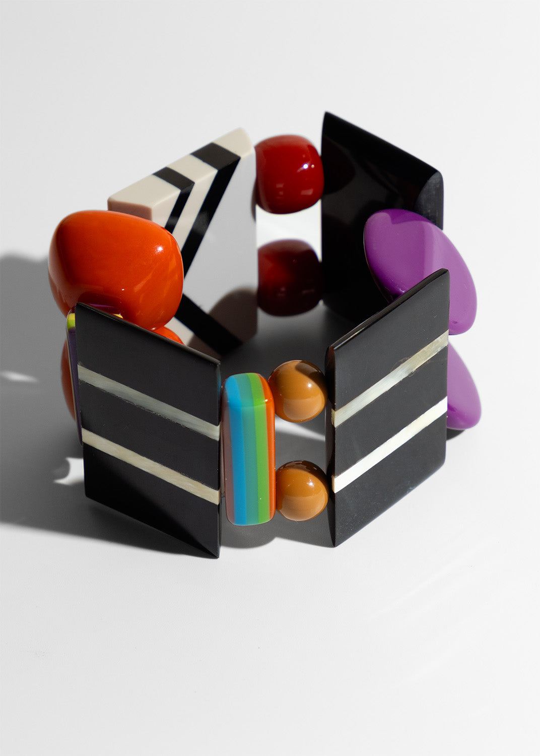 A bold bracelet crafted from resin in playful shapes and unexpected colors, inspired by the Milanese Memphis design movement. Handmade in our Athenian atelier, giving it the feel of a small collectible. Graphic, sculptural, and instantly iconic — it was made to stand out. Made with elastic silicon to fit all wrist sizes.