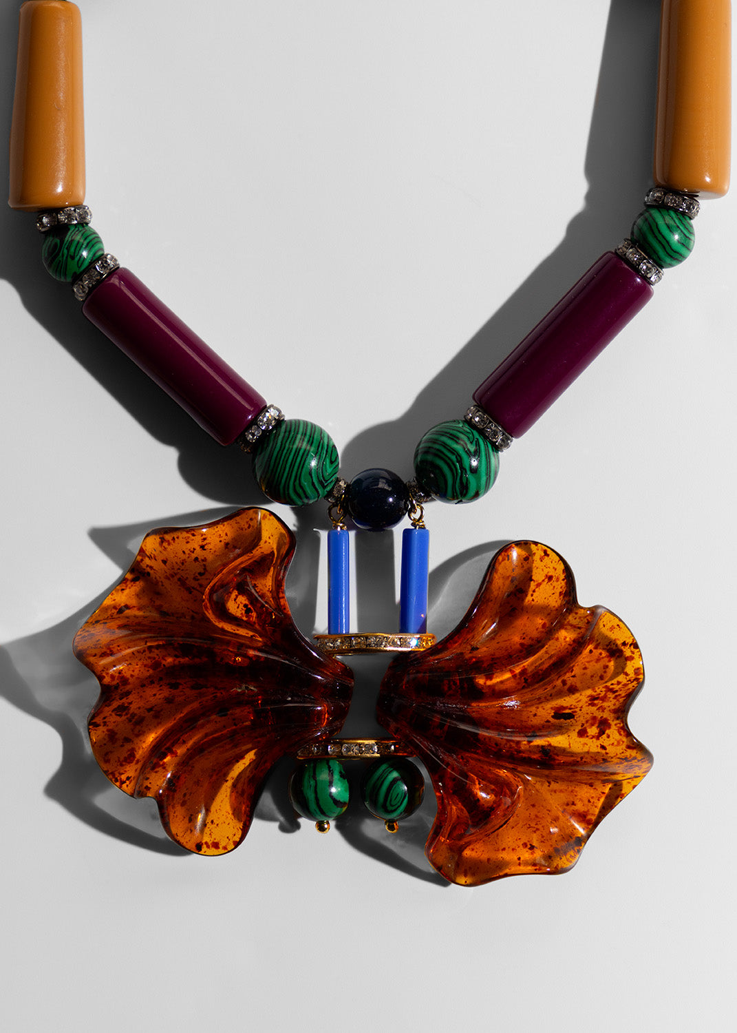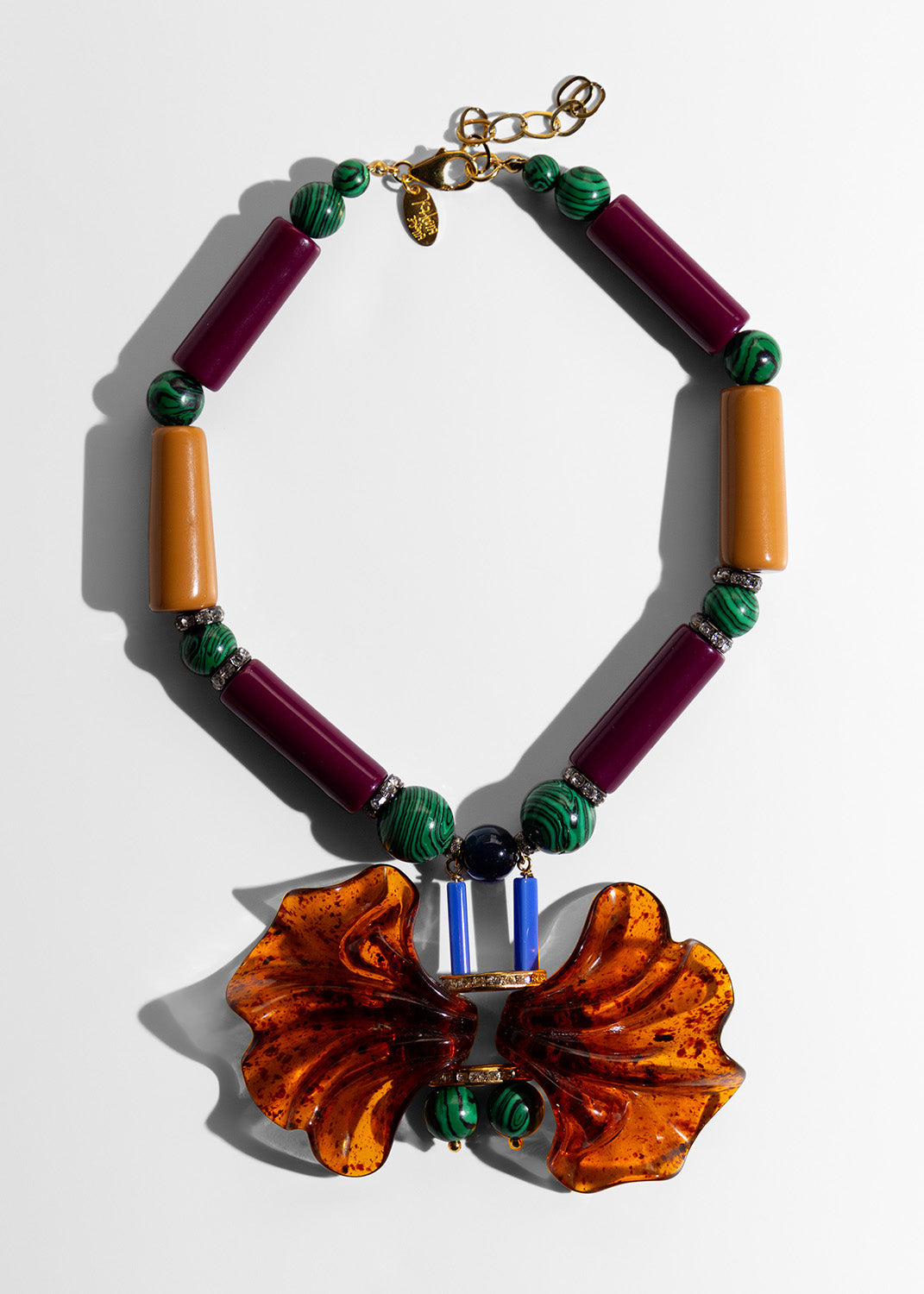 Bold and architectural, this necklace stands out with its striking mix of resin beads and sculptural shapes. The rich turtle tones meet greens and soft greys in a combination that feels both modern and timeless. Impressive yet easy to wear, it instantly transforms any look with its confident presence.