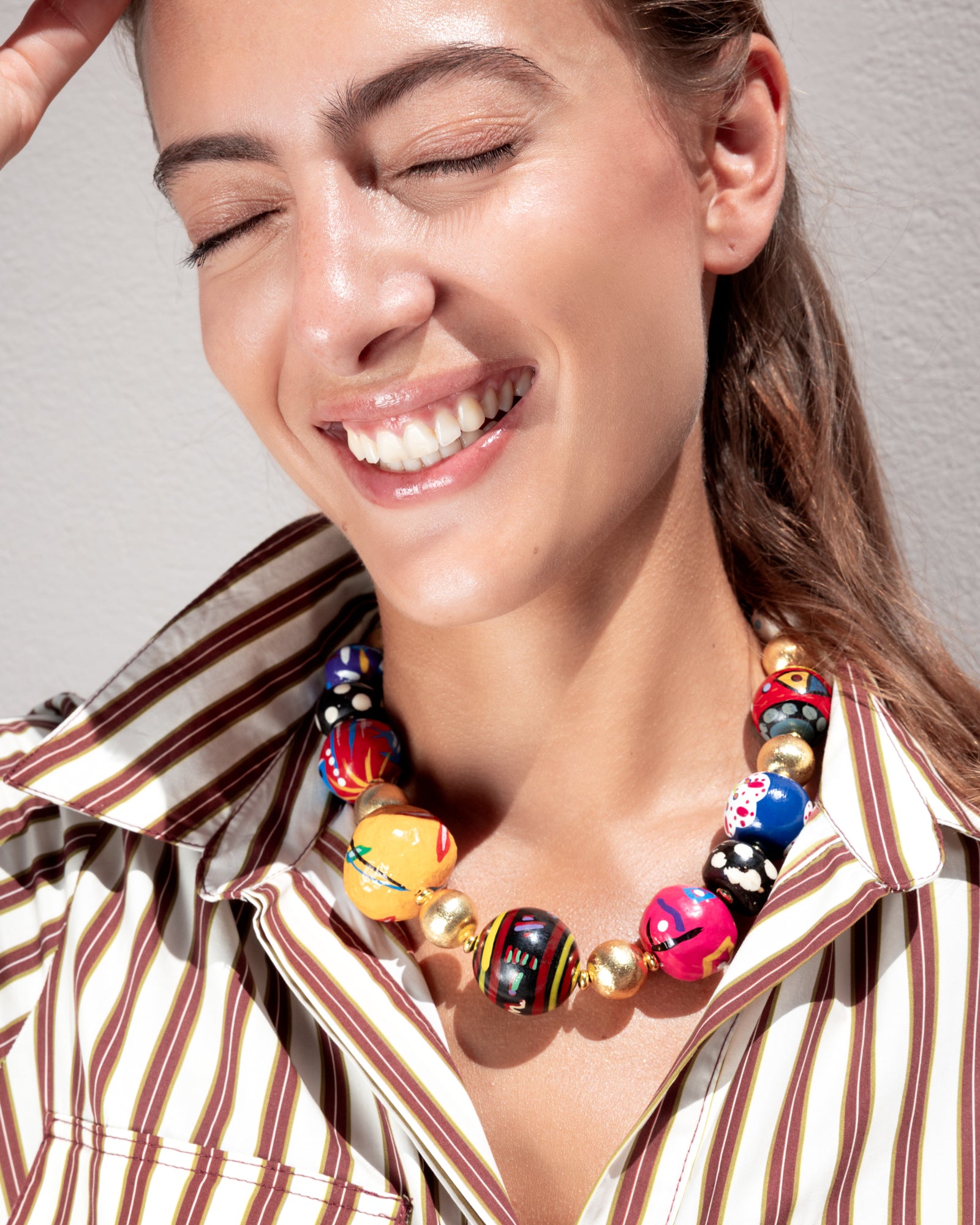 Have you seen our latest addition to our Tutti Frutti collection? It’s a mid-length piece with hand-painted wooden and papier-mâché beads, finished with gold-plated details. It’s bold yet so easy to wear, like a little colorful brushstroke that instantly lifts any outfit.