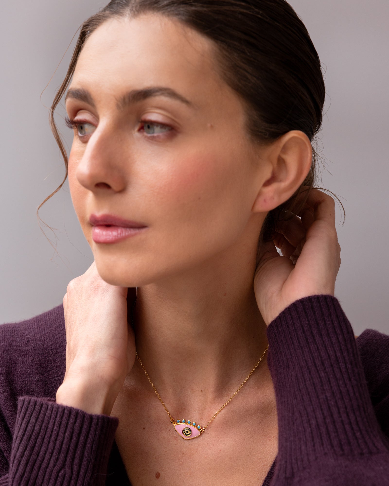 Celebrating 25 years of jewelry making, we relaunch our classic evil eye necklace. It features a gold plated motif adorned with a hand painted glass evil eye set on colorful enamel. The upper part is adorned with sparkling, colorful zirconia. We meticulously handcraft our evil eye pieces in our Atelier, for hours. We love it—they deserve every minute of our attention. So choose your own amulet of strength and protection from a wide array of colors.